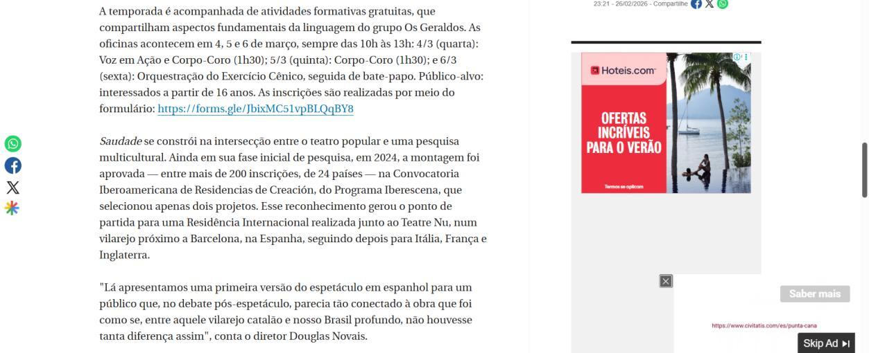 Espetáculo teatral “Saudade” no CCBB: música ao vivo e pesquisa multicultural - RADAR