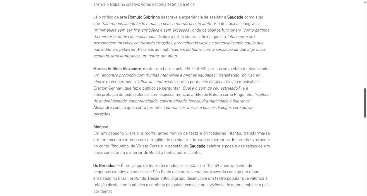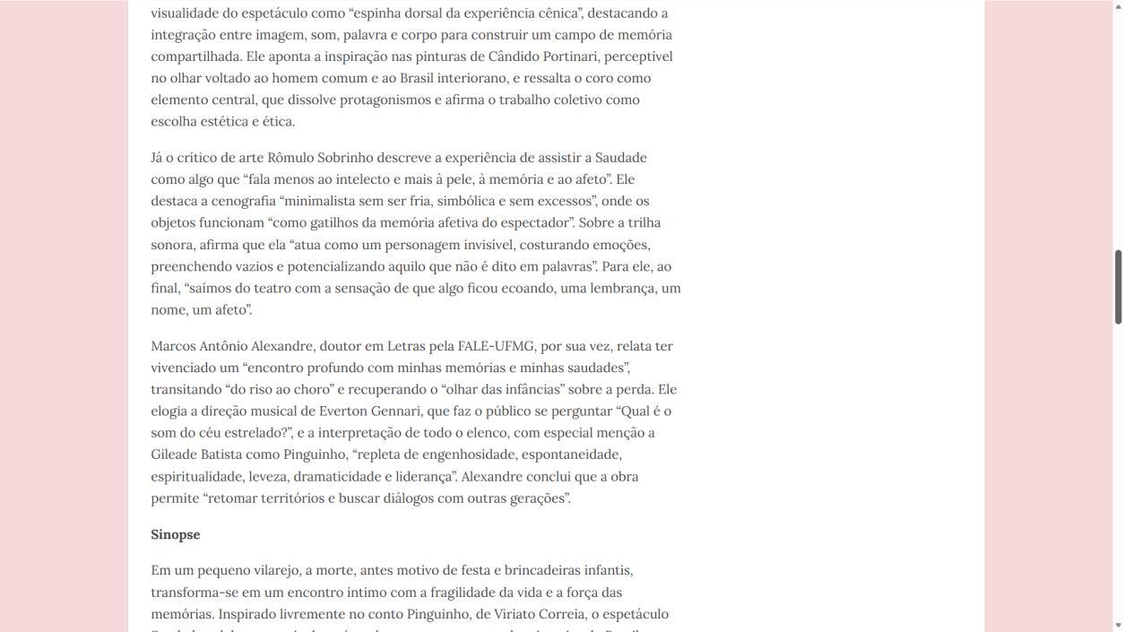 Marcos Antônio Alexandre, doutor em Letras pela FALE-UFMG, por sua vez, relata ter vivenciado um "encontro profundo com minhas memórias e minhas saudades", transitando "do riso ao choro" e recuperando o "olhar das infâncias" sobre a perda. Ele elogia a direção musical de Everton Gennari, que faz o público se perguntar "Qual é o som do céu estrelado?", e a interpretação de todo o elenco, com especial menção a Gileade Batista como Pinguinho, "repleta de engenhosidade, espontaneidade, espiritualidade, leveza, dramaticidade e liderança". Alexandre conclui que a obra permite "retomar territórios e buscar diálogos com outras gerações"