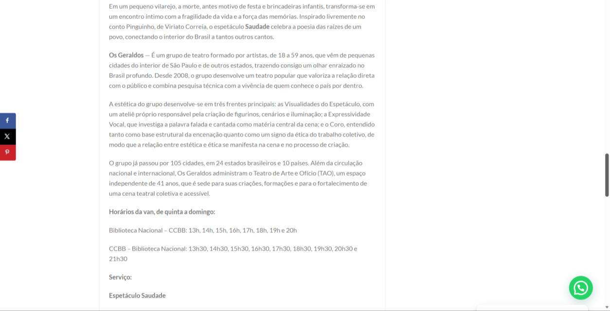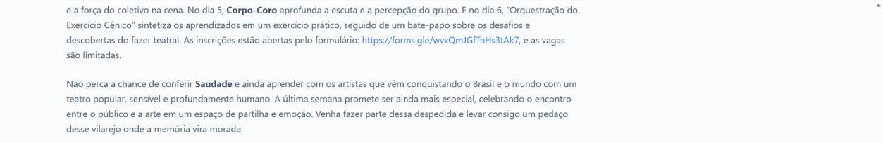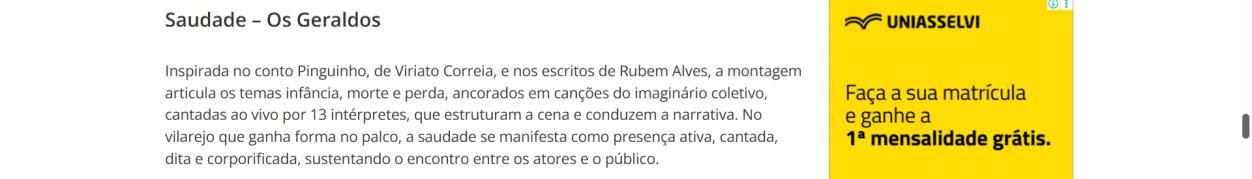 Não perca a chance de conferir Saudade e ainda aprender com os artistas que vêm conquistando o Brasil e o mundo com um teatro popular, sensível e profundamente humano. A última semana promete ser ainda mais especial, celebrando o encontro entre o público e a arte em um espaço de partilha e emoção. Venha fazer parte dessa despedida e levar consigo um pedaço desse vilarejo onde a memória vira morada.