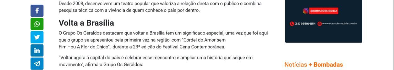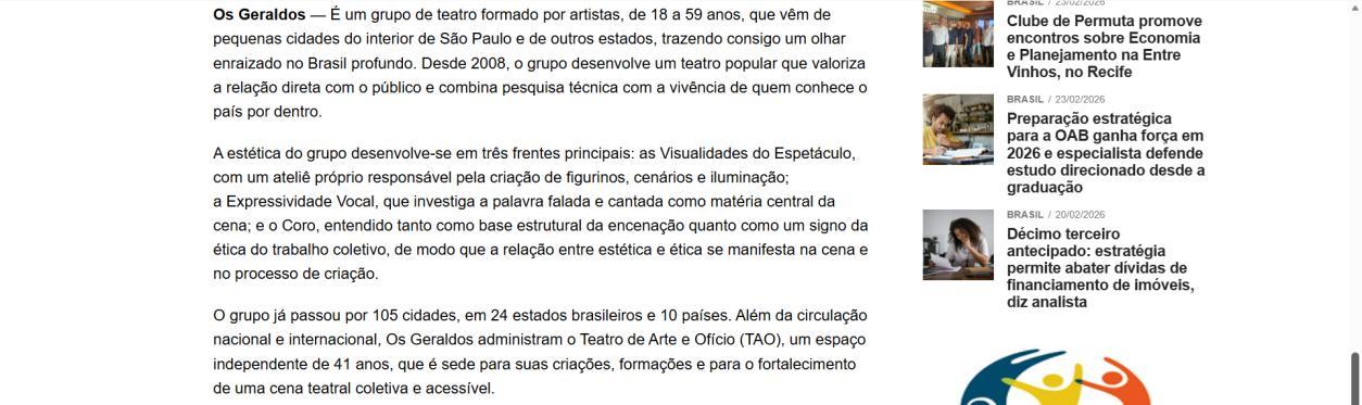 Os Geraldos É um grupo de teatro formado por artistas, de 18 a 59 anos, que vêm de pequenas cidades do interior de São Paulo e de outros estados, trazendo consigo um olhar enraizado no Brasil profundo. Desde 2008, o grupo desenvolve um teatro popular que valoriza a relação direta com o público e combina pesquisa técnica com a vivência de quem conhece o país por dentro.