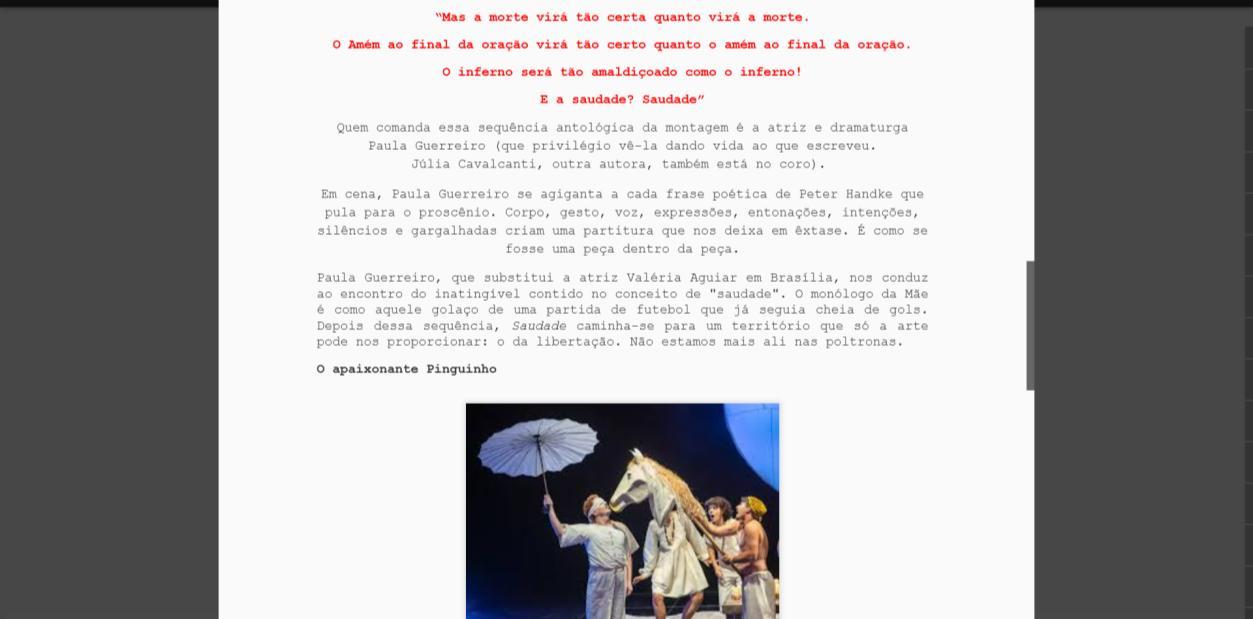 Sobre a dramaturgia e direção, Maggio publicou: “A dramaturgia delicada de Julia Cavalcante e Paula Guerreiro parte da obra de Viriato Corrêa, um homem absolutamente de teatro. Mistura-se com a delicadeza de Rubem Alves e as construções cênicas e sonoras da sala de ensaio comandada por Douglas Novais e Everton Gennari. O que se levanta no palco, aviso de antemão sem medo de dar spoiller, é uma pequena obra-prima do teatro popular brasileiro.”
