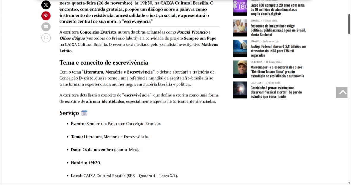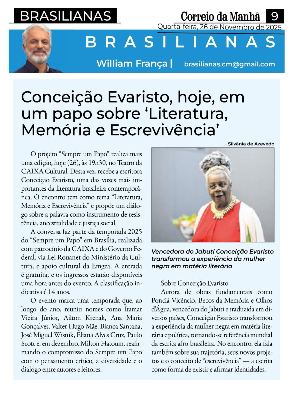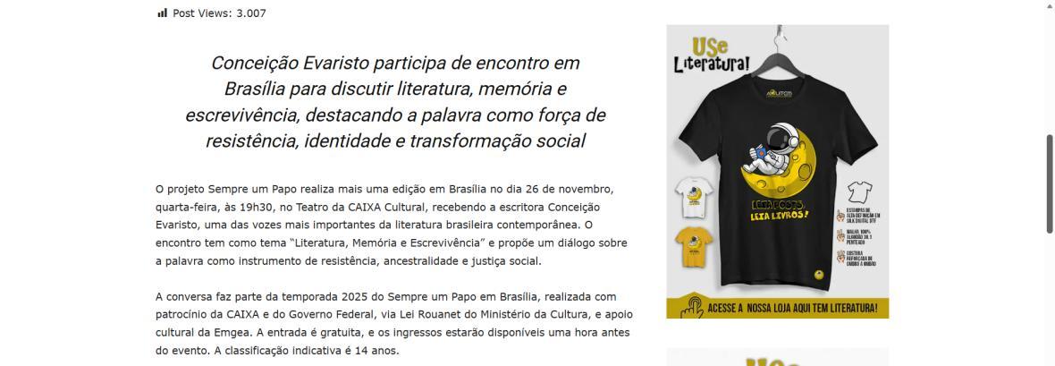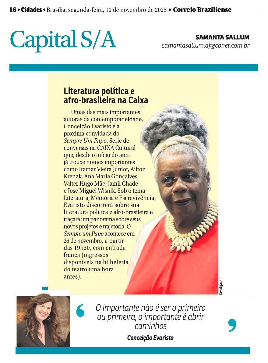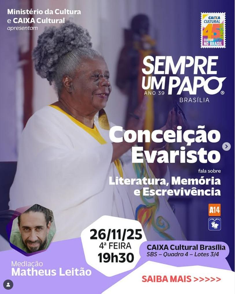 O projeto Sempre um Papo realiza mais uma edição em Brasília no dia 26 de novembro, quarta-feira, às 19h30, no Teatro da CAIXA Cultural, recebendo a escritora Conceição Evaristo, uma das vozes mais importantes da literatura brasileira contemporânea. O encontro tem como tema “Literatura, Memória e Escrevivência” e propõe um diálogo sobre a palavra como instrumento de resistência, ancestralidade e justiça social.
