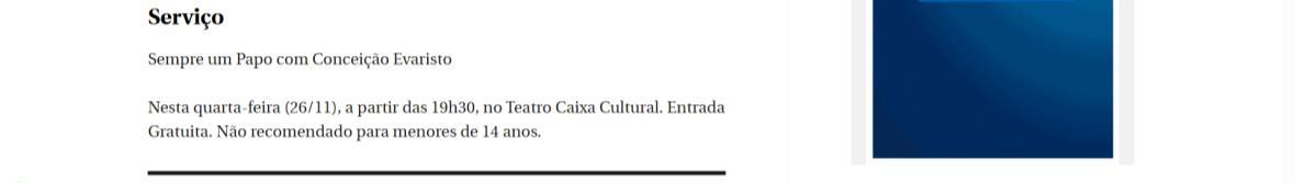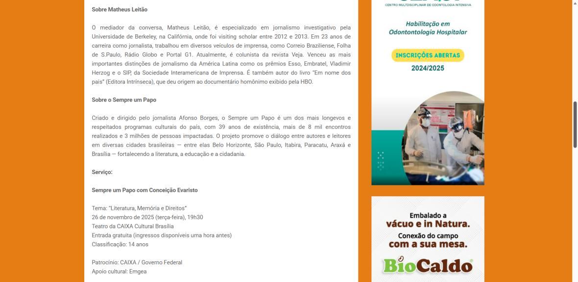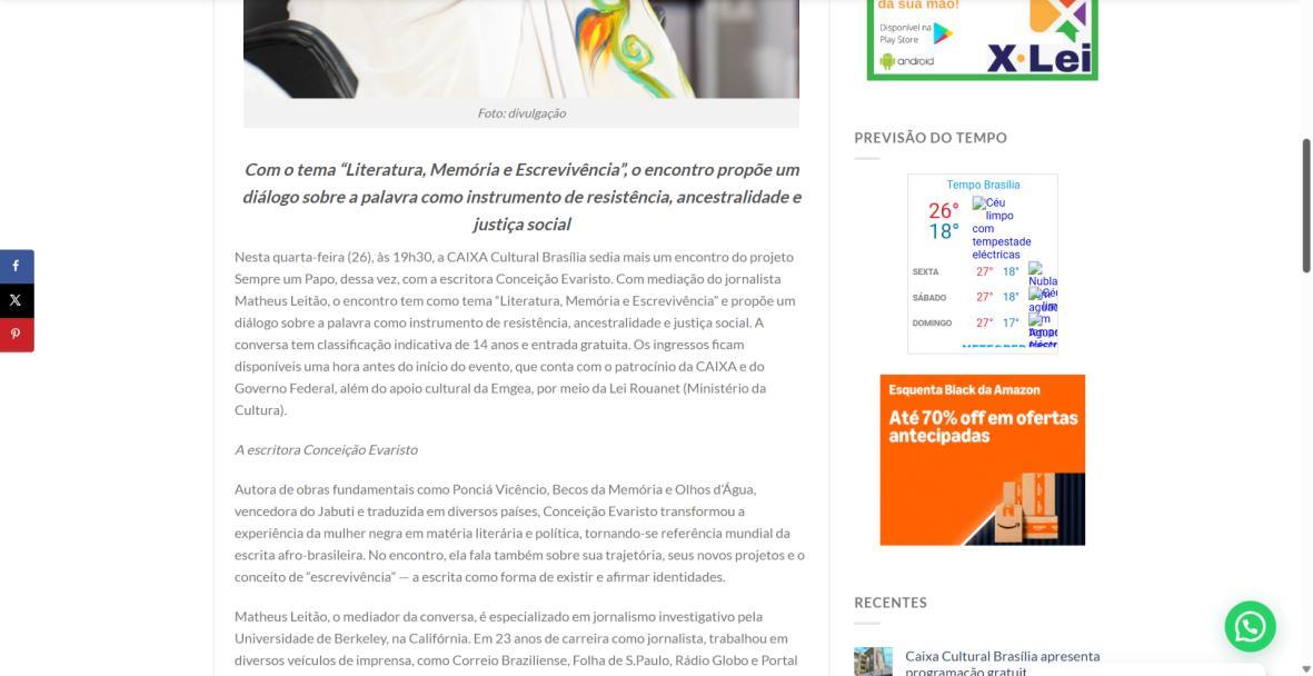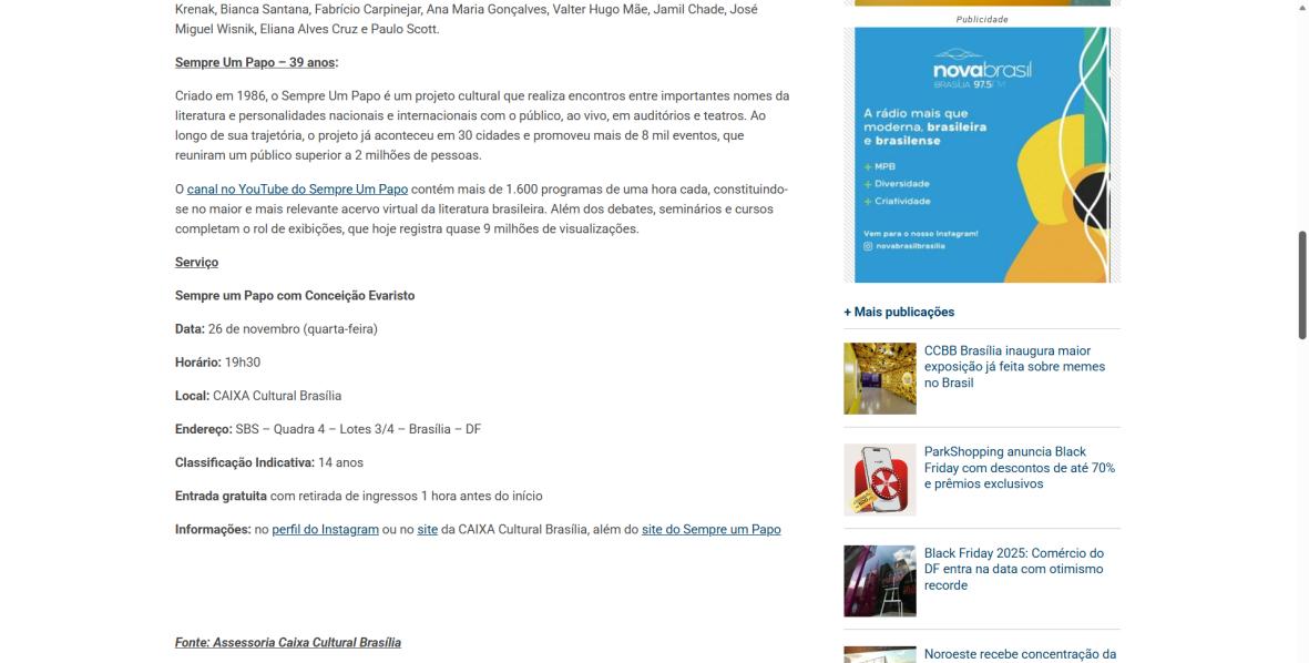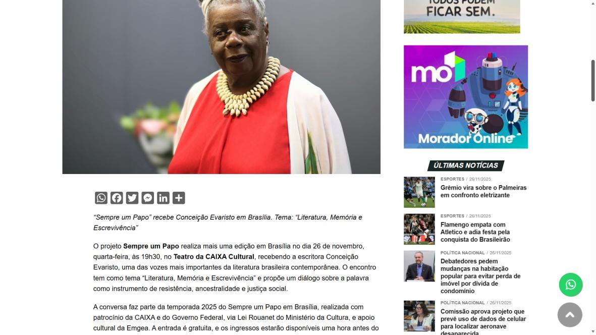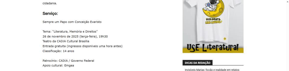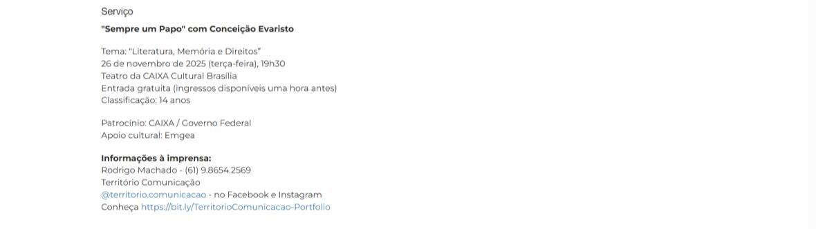 O projeto Sempre um Papo realiza mais uma edição em Brasília no dia 26 de novembro, quarta-feira, às 19h30, no Teatro da CAIXA Cultural, recebendo a escritora Conceição Evaristo, uma das vozes mais importantes da literatura brasileira contemporânea. O encontro tem como tema “Literatura, Memória e Escrevivência” e propõe um diálogo sobre a palavra como instrumento de resistência, ancestralidade e justiça social.
