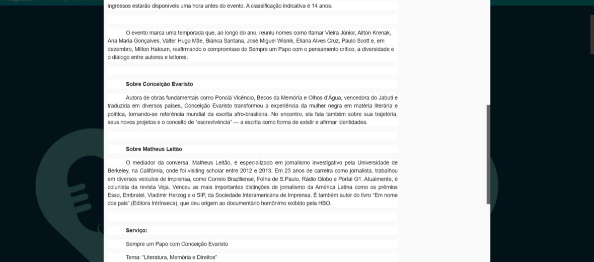O evento marca uma temporada que, ao longo do ano, reuniu nomes como Itamar Vieira Júnior, Ailton Krenak, Ana Maria Gonçalves, Valter Hugo Mãe, Bianca Santana, José Miguel Wisnik, Eliana Alves Cruz, Paulo Scott e, em dezembro, Milton Hatoum, reafirmando o compromisso do Sempre um Papo com o pensamento crítico, a diversidade e o diálogo entre autores e leitores.