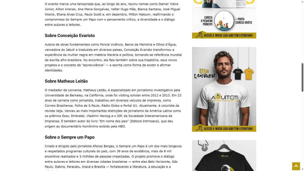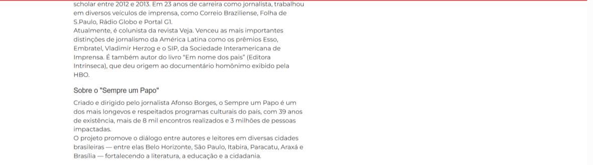 Criado e dirigido pelo jornalista Afonso Borges, o Sempre um Papo é um dos mais longevos e respeitados programas culturais do país, com 39 anos de existência, mais de 8 mil encontros realizados e 3 milhões de pessoas impactadas. O projeto promove o diálogo entre autores e leitores em diversas cidades brasileiras entre elas Belo Horizonte, São Paulo, Itabira, Paracatu, Araxá e Brasília fortalecendo a literatura, a educação e a cidadania.
