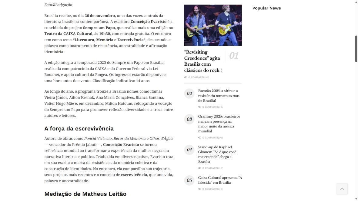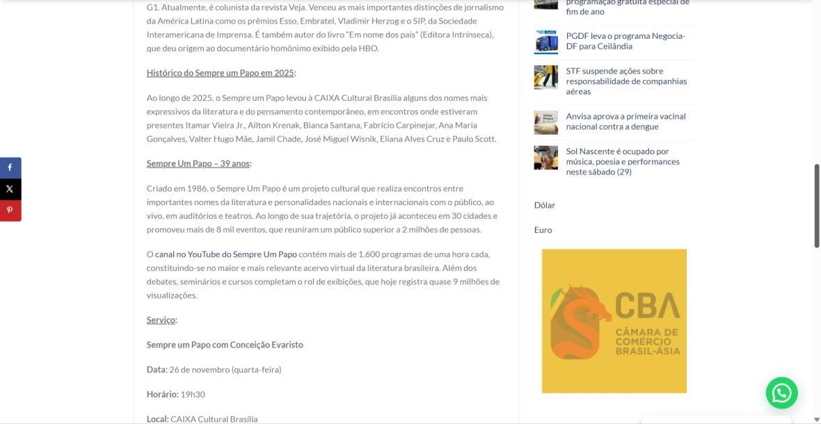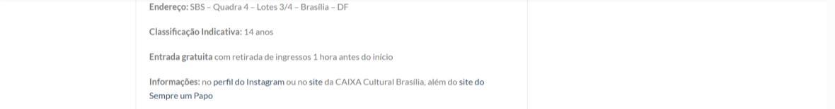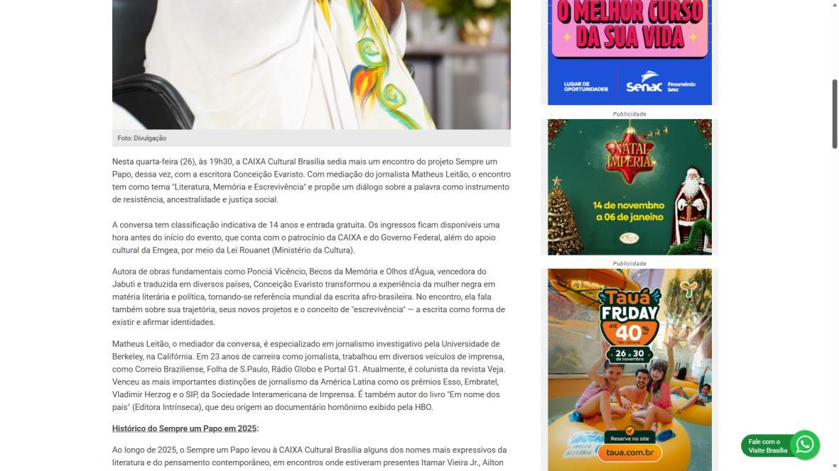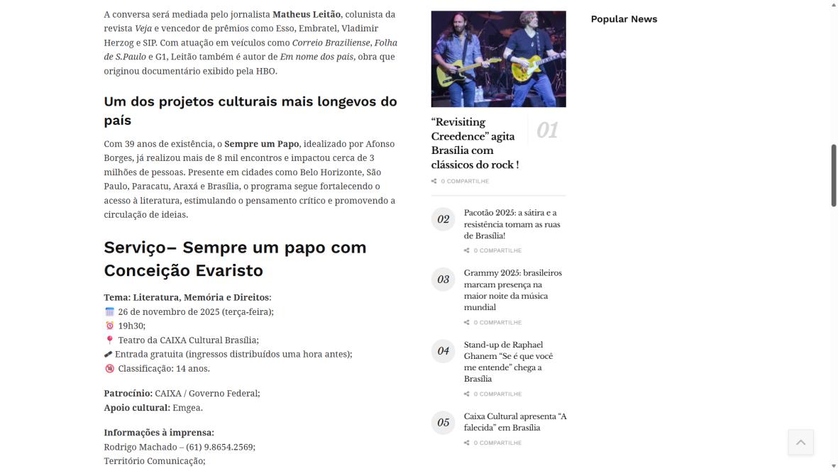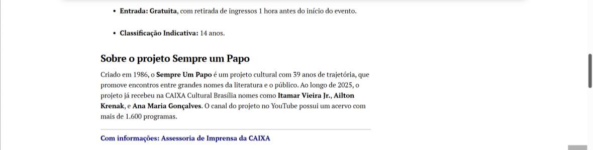 A conversa faz parte da temporada 2025 do Sempre um Papo em Brasília, realizada com patrocínio da CAIXA e do Governo Federal, via Lei Rouanet do Ministério da Cultura, e apoio cultural da Emgea. A entrada é gratuita, e os ingressos estarão disponíveis uma hora antes do evento. A classificação indicativa é 14 anos.