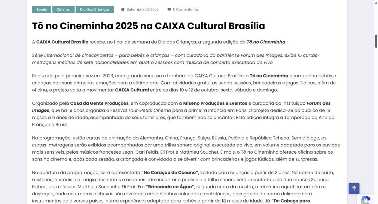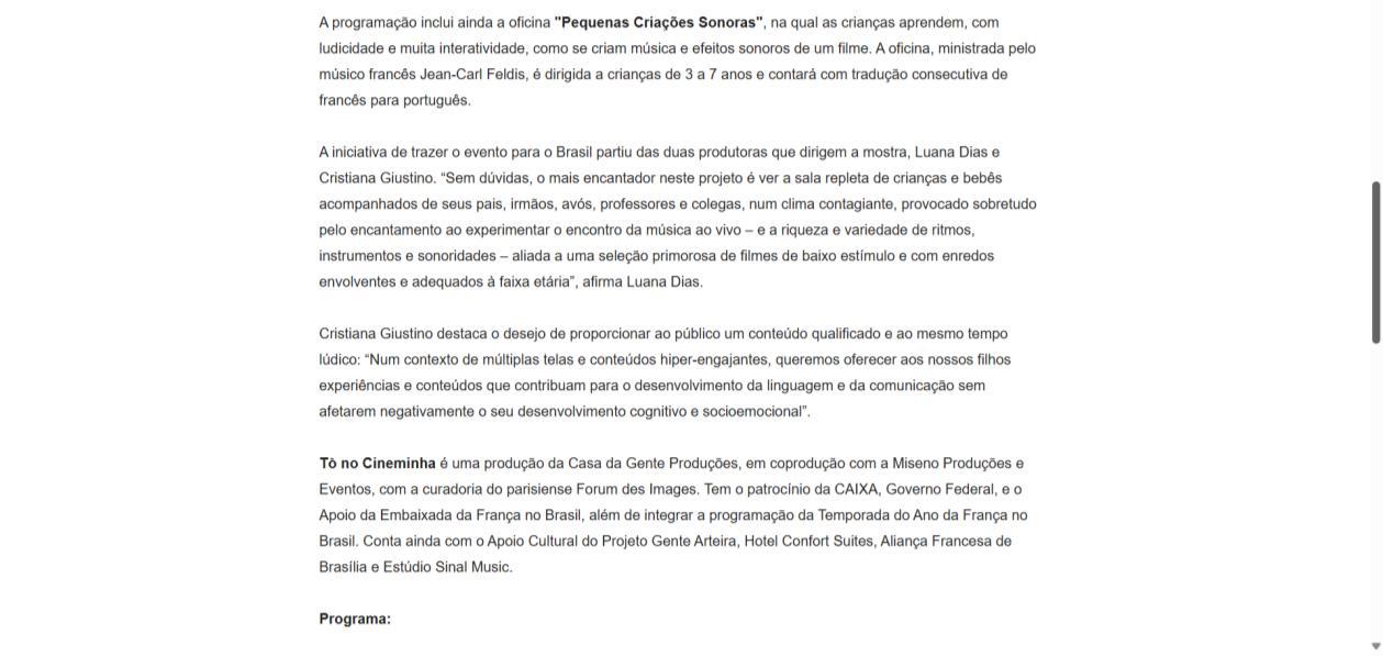 Organizado pela Casa da Gente Produções, em coprodução com a Miseno Produções e Eventos e curadoria da instituição Forum des Images, que há 19 anos organiza o Festival Tout-Petits Cinéma para a primeira infância em Paris. O projeto dedicase ao público de 18 meses a 6 anos de idade, acompanhado de seus familiares, que também irão se encantar Esta edição integra a Temporada do Ano da França no Brasil.