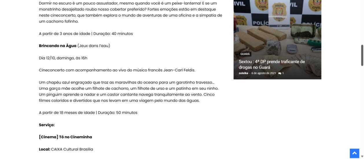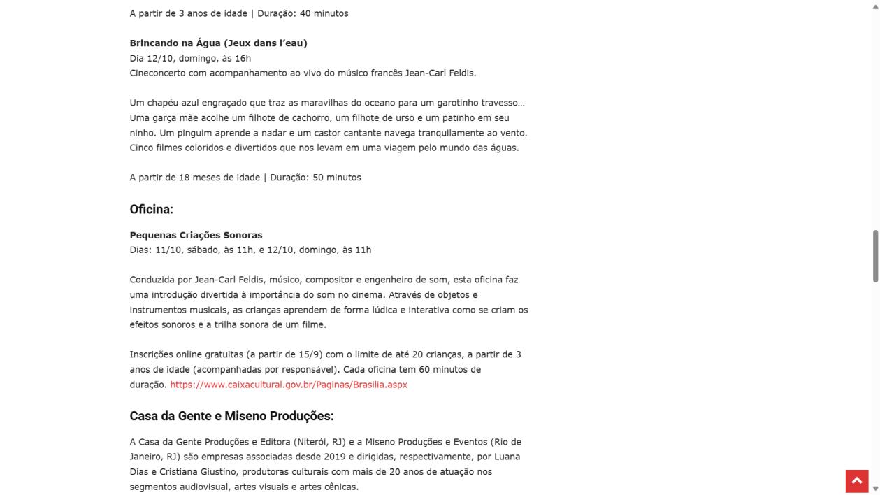 Dias: 11/10, sábado, às 11h, e 12/10, domingo, às 11h Conduzida por Jean-Carl Feldis, músico, compositor e engenheiro de som, esta oficina faz uma introdução divertida à importância do som no cinema. Através de objetos e instrumentos musicais, as crianças aprendem de forma lúdica e interativa como se criam os efeitos sonoros e a trilha sonora de um filme. Inscrições online gratuitas (a partir de 15/9) com o limite de até 20 crianças, a partir de 3 anos de idade (acompanhadas por responsável). Cada oficina tem 60 minutos de duração. https://www.caixacultural.gov.br/Paginas/Brasilia.aspx