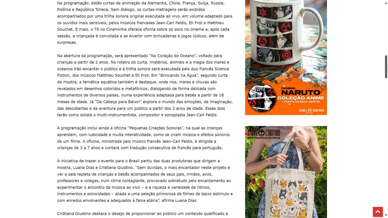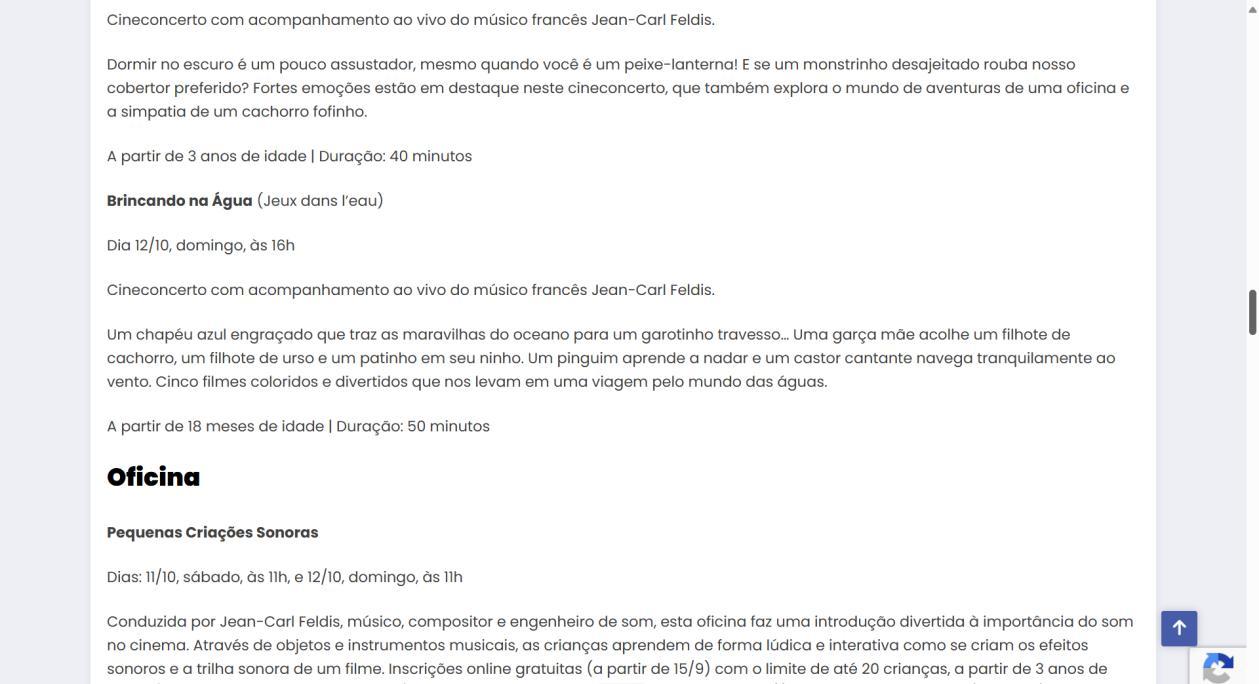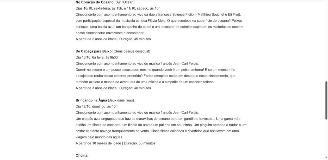 Na abertura da programação, será apresentado “No Coração do Oceano”, voltado para crianças a partir de 2 anos. No roteiro do curta, mistérios, animais e a magia dos mares e oceanos irão encantar o público e a trilha sonora será executada pelo duo francês Science Fiction, dos músicos Matthieu Souchet e Eli Frot. Em “Brincando na Água”, segundo curta da mostra, a temática aquática também é destaque, onde rios, mares e chuvas são revelados em desenhos coloridos e metafóricos, dialogando de forma delicada com instrumentos de diversos países, numa experiência adaptada para bebês a partir de 18 meses de idade. Já “De Cabeça para Baixo!” explora o mundo das emoções, da imaginação, das descobertas e da aventura para um público a partir dos 3 anos de idade. Esses dois terão como solista o multi-instrumentista, compositor e sonoplasta Jean-Carl Feldis.