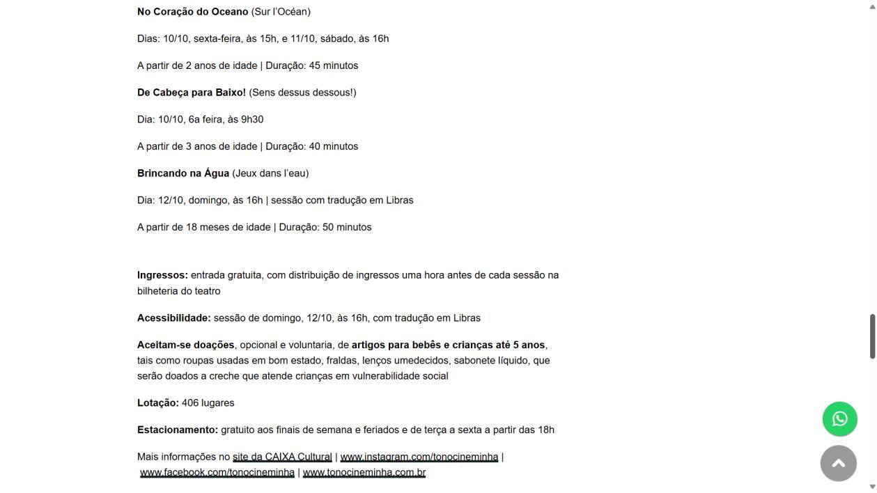 Na programação, estão curtas de animação da Alemanha, China, França, Suíça, Rússia, Polônia e República Tcheca. Sem diálogo, os curtas-metragens serão exibidos acompanhados por uma trilha sonora original executada ao vivo, em volume adaptado para os ouvidos mais sensíveis, pelos músicos franceses Jean-Carl Feldis, Eli Frot e Matthieu Souchet. E mais, o Tô no Cineminha oferece oficina sobre os sons no cinema e, após cada sessão, a criançada é convidada a se divertir com brincadeiras e jogos lúdicos, além de surpresas.
