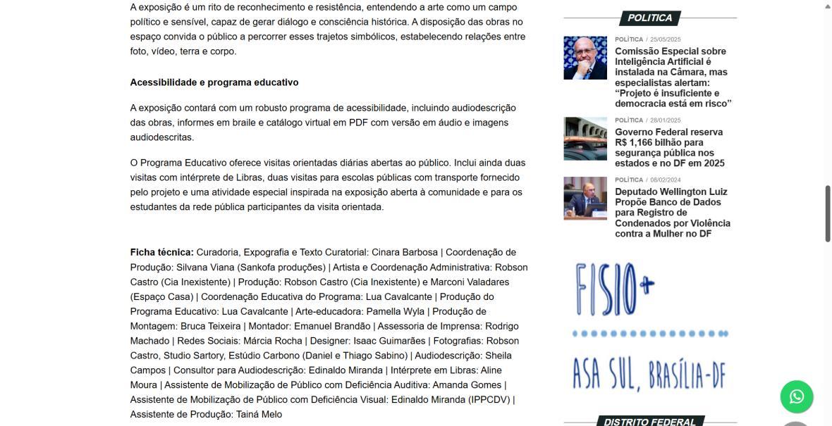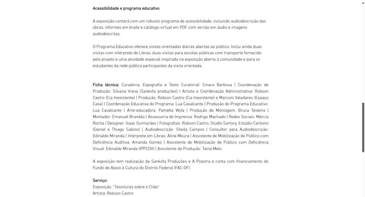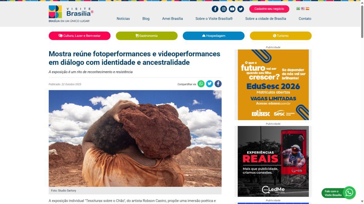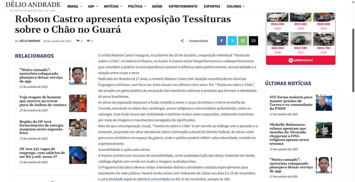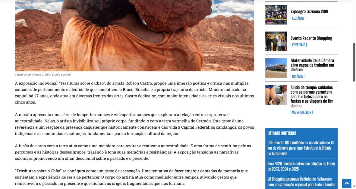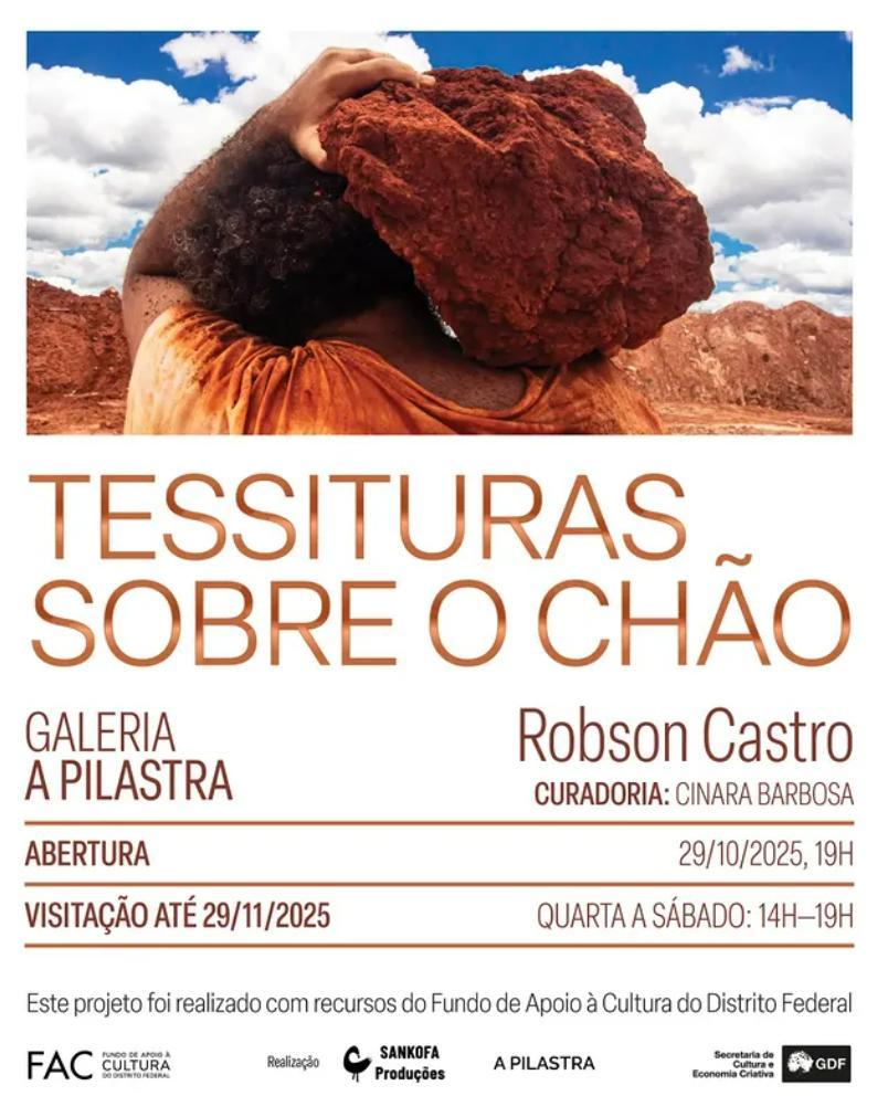 A exposição individual "Tessituras sobre o Chão", do artista Robson Castro, propõe uma imersão poética e crítica nas múltiplas camadas de pertencimento e identidade que constituem o Brasil, Brasília e a própria trajetória do artista. Mineiro radicado na capital há 27 anos, onde atua em diversas frentes das artes, Castro dedica-se, com maior intensidade, às artes visuais nos últimos cinco anos.