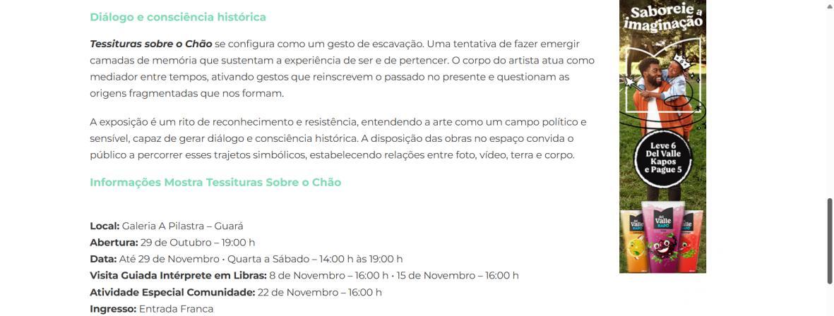 "Tessituras sobre o Chão" se configura como um gesto de escavação. Uma tentativa de fazer emergir camadas de memória que sustentam a experiência de ser e de pertencer. O corpo do artista atua como mediador entre tempos, ativando gestos que reinscrevem o passado no presente e questionam as origens fragmentadas que nos formam.