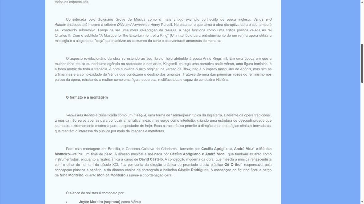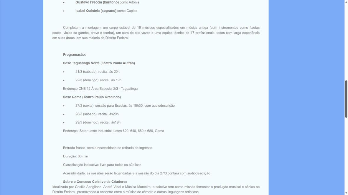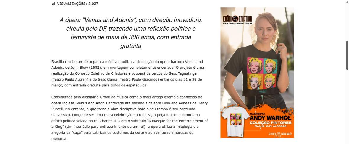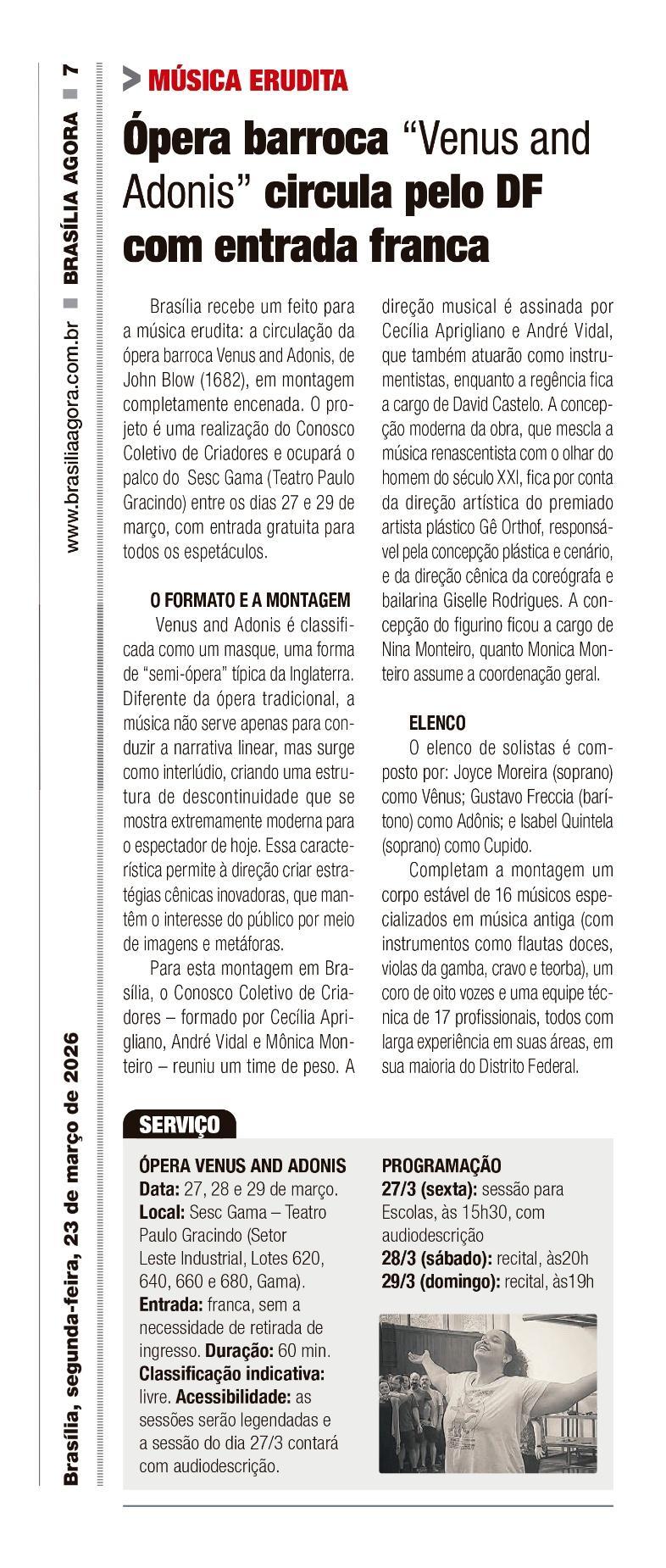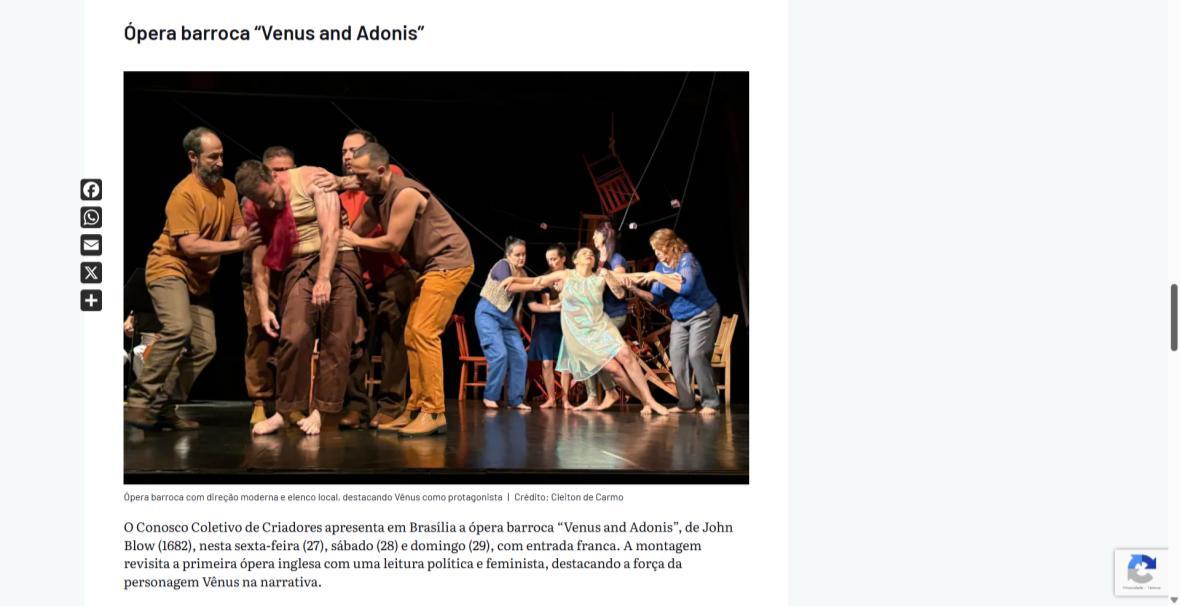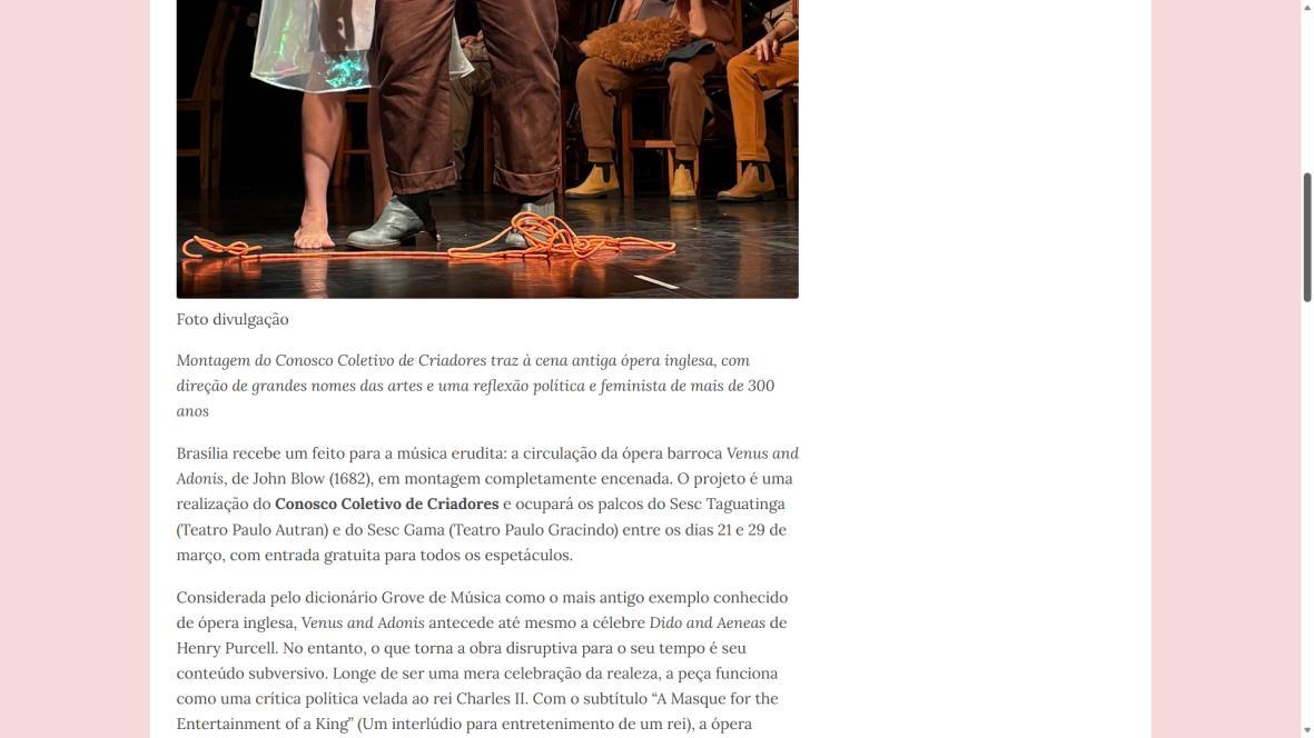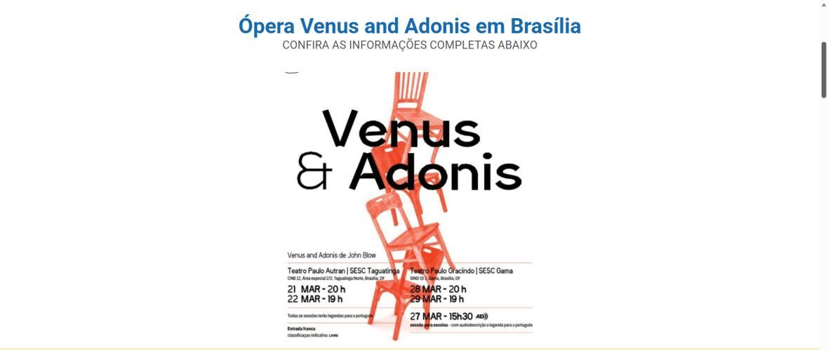 Olá, é um prazer imenso falar contigo, ouvinte da Cultura FM. Aqui é [nome do integrante], do Conosco Coletivo de Criadores, e venho te convidar para conferir um projeto pra lá de especial: a reestreia da ópera barroca Venus and Adonis aqui no Distrito Federal.