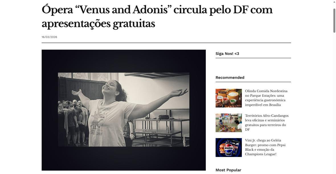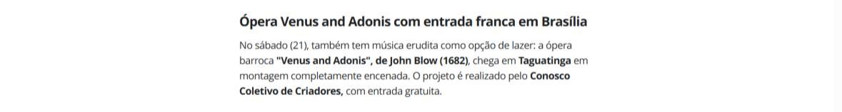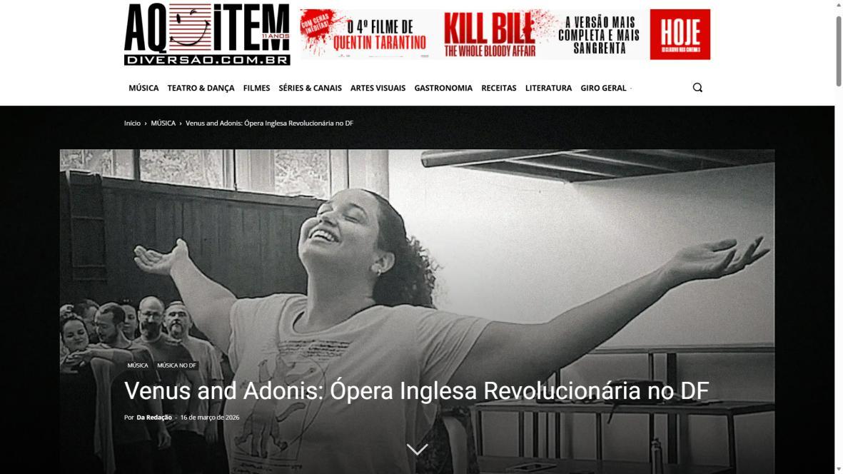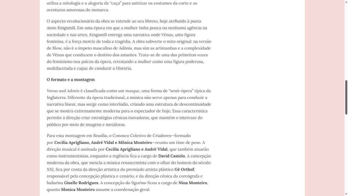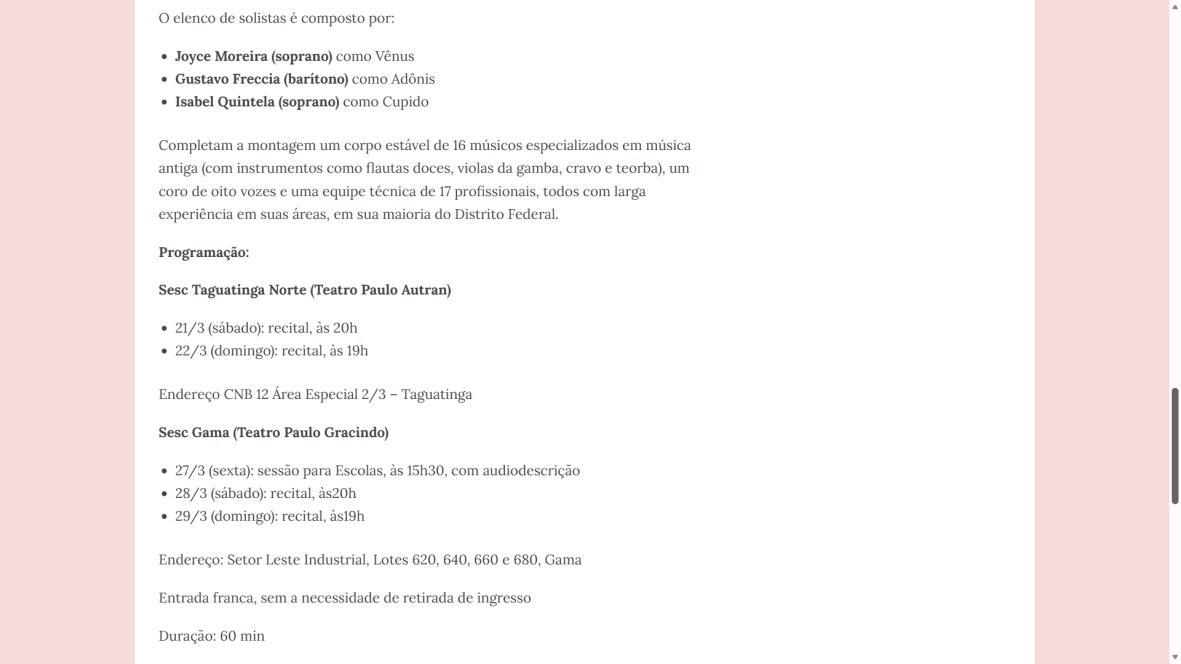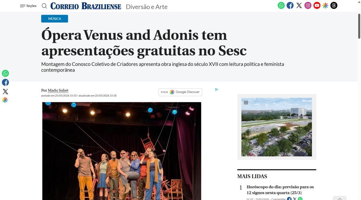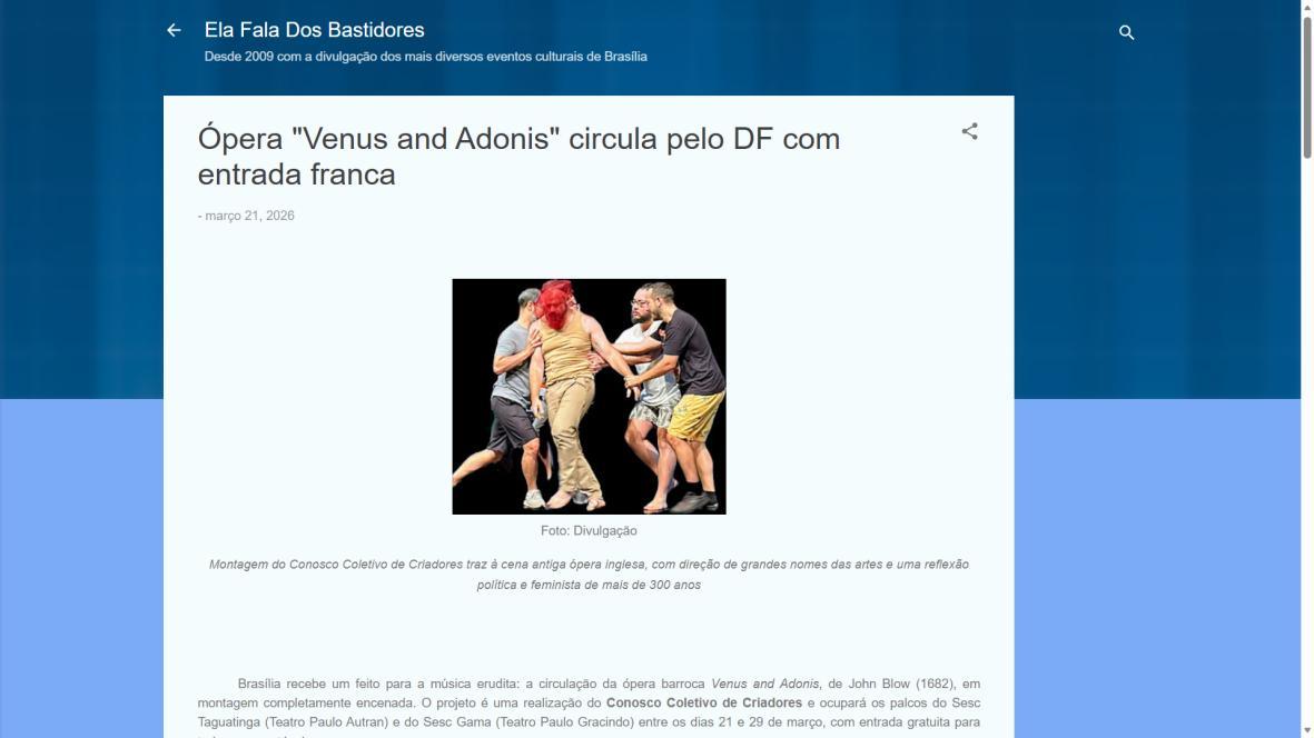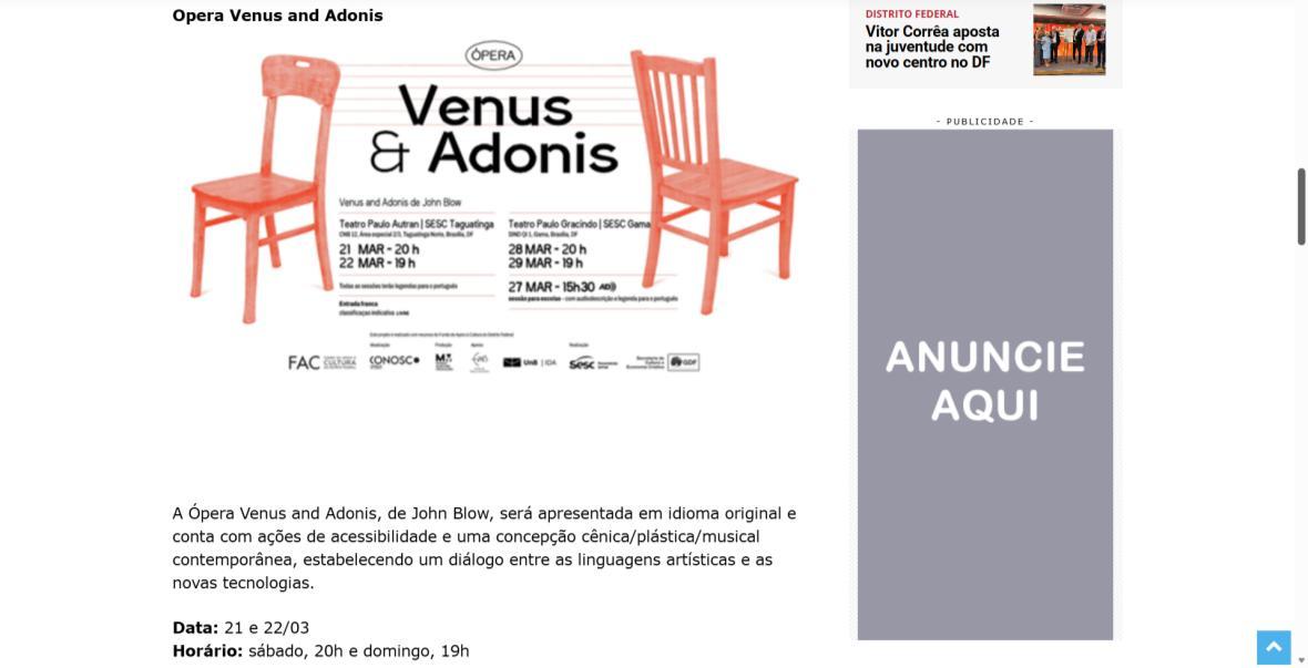 Olá, é um prazer imenso falar contigo, ouvinte da Cultura FM. Aqui é [nome do integrante], do Conosco Coletivo de Criadores, e venho te convidar para conferir um projeto pra lá de especial: a reestreia da ópera barroca Venus and Adonis aqui no Distrito Federal.