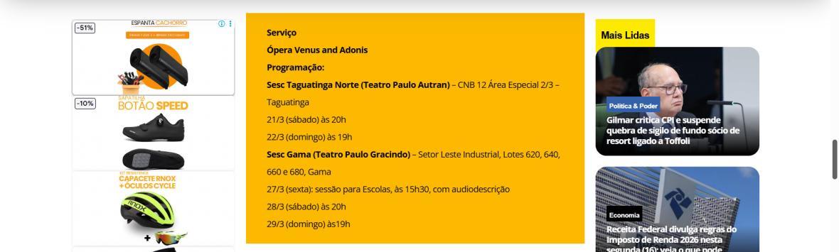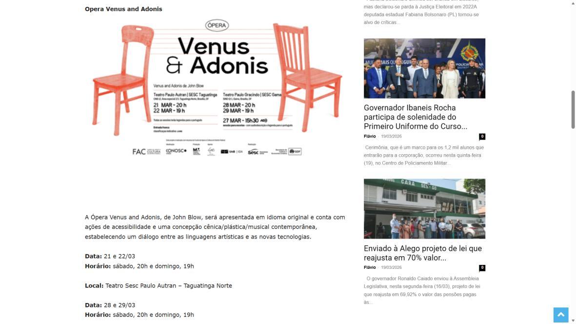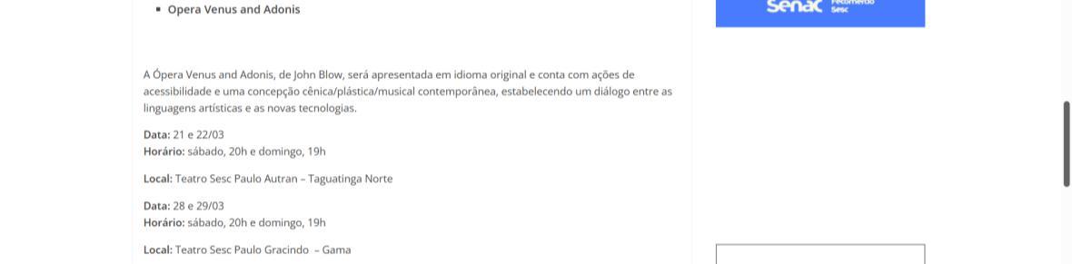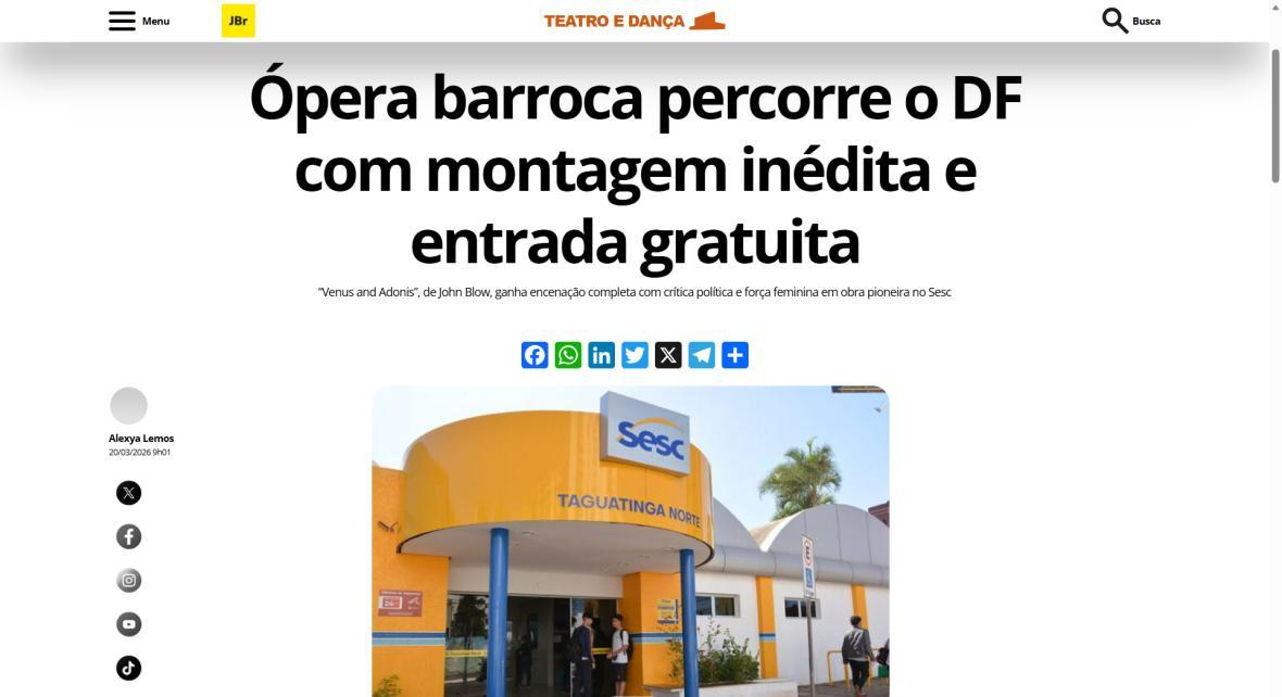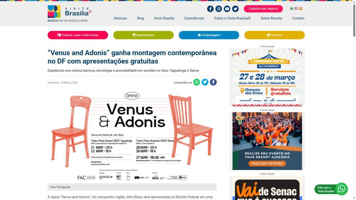 Brasília recebe um feito para a música erudita: a circulação da ópera barroca Venus and Adonis, de John Blow (1682), em montagem completamente encenada. O projeto é uma realização do Conosco Coletivo de Criadores e ocupará os palcos do Sesc Taguatinga (Teatro Paulo Autran) e do Sesc Gama (Teatro Paulo Gracindo) entre os dias 21 e 29 de março, com entrada gratuita para todos os espetáculos.
