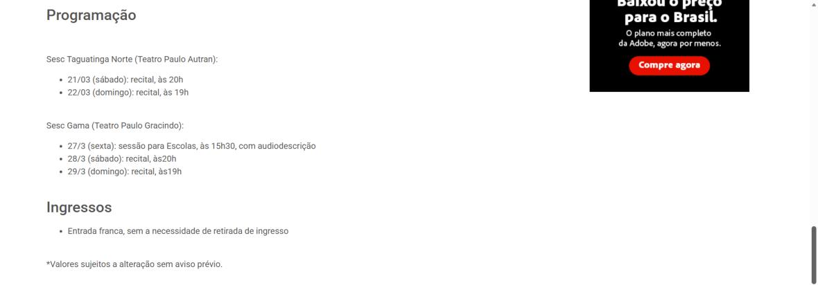 As apresentações são gratuitas e acontecem no Sesc Teatro Paulo Gracindo, no dia 27 de março, às 15h30, em uma sessão para escolas com audiodescrição, e também nos dias 28 e 29, sábado às 20h e domingo às 19h.