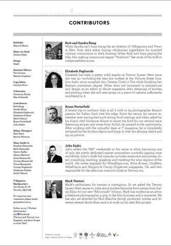 Publisher Elena di Maria Editor-in-Chief Jessica Allen Design Small Assistant Editors Tara Downs Natalie Urquhart Copy Editor Carolyn Pioro Columnists Giovanna Alonzi Max Stefanelli Contributors Rick Kang Sandra Kang Elizabeth Pagliacolo Stephanie Palmer Mark Venturi Bryan Porterfield John Szabo Admin. Managers Patti Shaw Karina Watsone Many thanks to Stephen Alexander Bella Alexander Simon Gadke Albion Macleod Anna Mammoliti Cosimo Mammoliti Vince Mammoliti Cosimo Pagliacolo Stephanie Palmer Sarah Watson T Magazine Headquarters 720 Queen St. W. Toronto, M6J 1E8 For inquiries and comments please email: jessie@terroni.ca