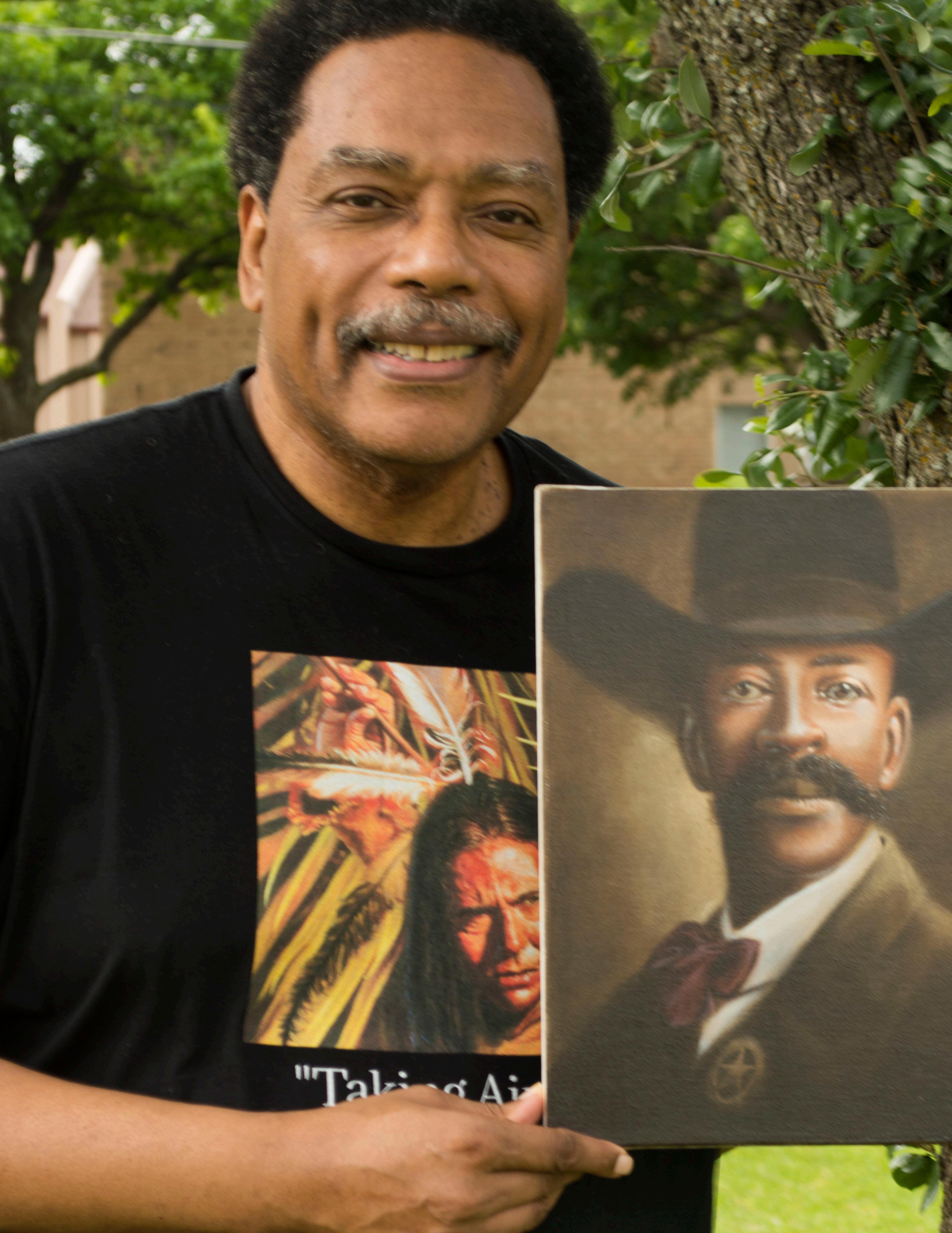 James shares he began drawing and painting memories of his childhood spent with his Rodeo Cowboy grandfather and his Native American grandmother. “I started drawing characters of the old west sparked by the stories of my grandparents. After moving to Texas in 2008, my focus for painting began to include the relationships of African Americans, Native Americans, and Mexican Americans in the development of the old west,” he says.