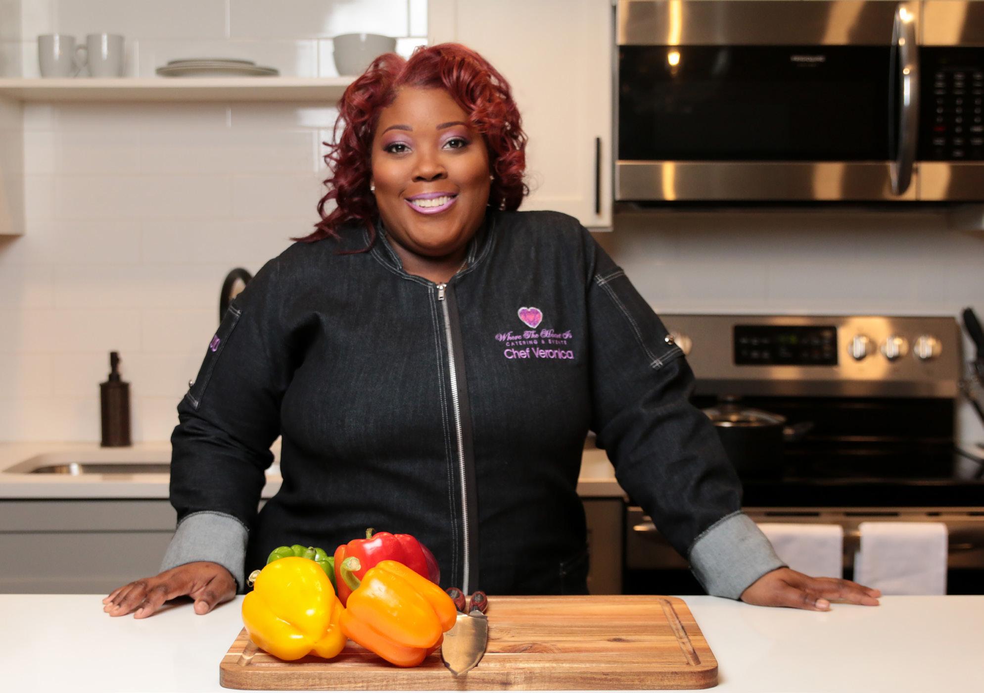 Born and raised in the inner city of Cleveland, particularly in the Collinwood community, Veronica discovered her passion for cooking at a very young age. She recalls working alongside her mother in the kitchen. Her father worked second shift at Ford Motor Company, and Veronica would prepare him food and put it in the oven until he came home. She says, “I remember sleeping light and listening for his key in the lock, and then I would go running to the kitchen to get his food out for him to eat dinner. I would sit there with my hands on my cheek, smiling and waiting for him to eat the meal I had designed for him. My father would eat the whole plate as I sat there and watched him.”