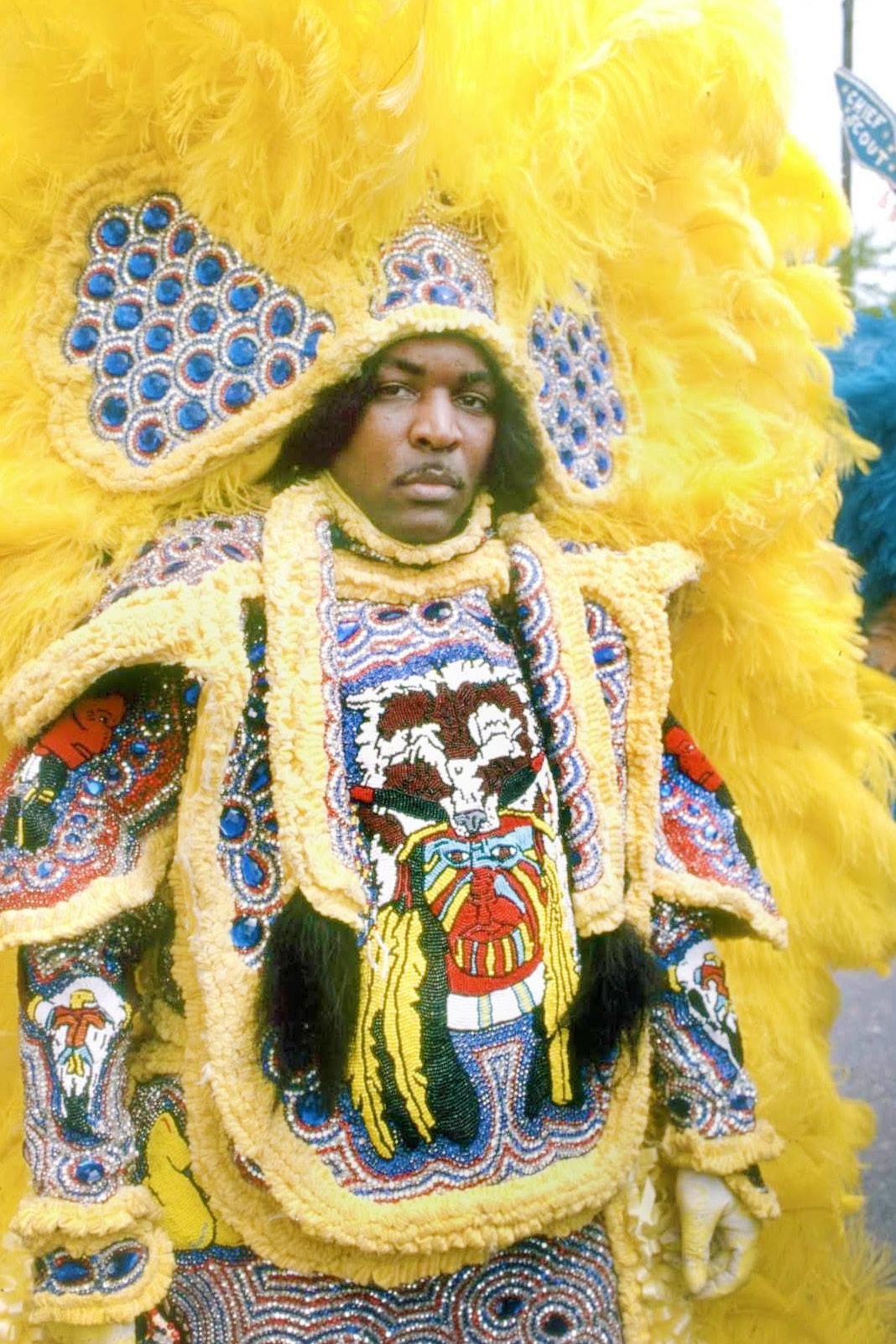He rejoined the family processions and, that year, created his own costume. While participating in the event, Thomas’s costume and presence in the “2nd Line” procession caught the attention of the community, and people began whispering about how Thomas had outshone the new chief of their tribe. Thomas had created a bright yellow costume, and people said Thomas was the “prettier” one of the two of them. This was unusual, particularly as Thomas was quite young at the time, and this ended up creating a certain degree of jealousy and friction with the new Big Chief.