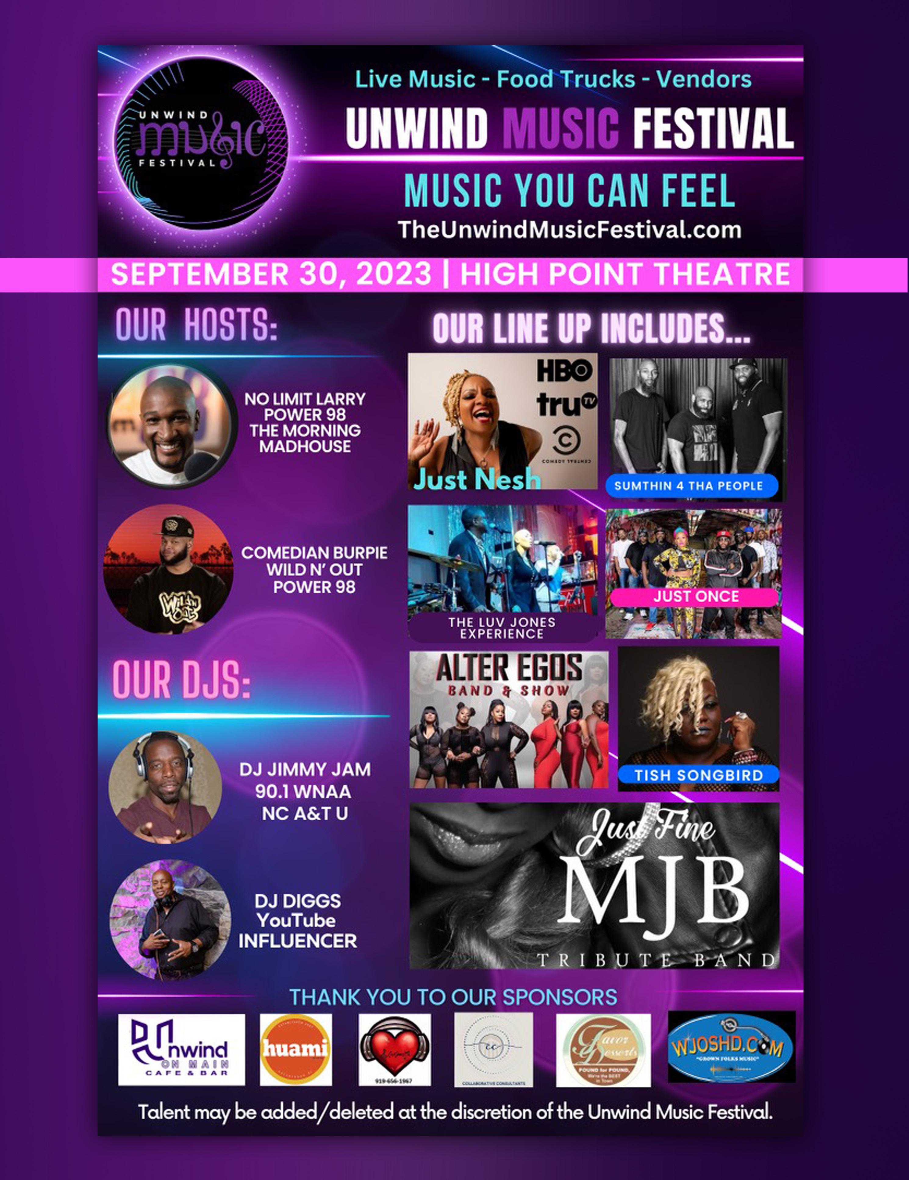 Slated to happen on September 30, 2023, at the High Point Theater in High Point, NC. The one-day event will showcase musical talent from around North Carolina. There will be food trucks and vendors on sight, and much more. The team that is producing The Unwind Music Festival includes Anthony, along with his mother Norine Anderson, LaKeith Stevenson, Kika James, and Derrick Jones. The lineup of talent includes Just Once, The Luv Jones Experience, Sumthin 4 Tha People, Alter Egos, and a Mary J. Blige tribute produced by Just Fine.