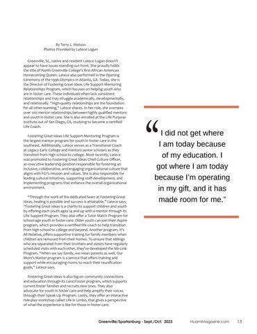 As the future unfolds for Latece, her purpose will be the same. She says, “On a professional note, I will strive to enable Fostering Great Ideas to be known as a one-stop shop for the needs of youth in foster care and will equip our volunteers and staff to do just that. Personally, I plan to continue to educate myself on building leaders to empower youth and families to live life out loud and unapologetically. Soon, I will be a certified life coach and own a Performance Coach Practice to help people perform in whatever capacity they desire.”
