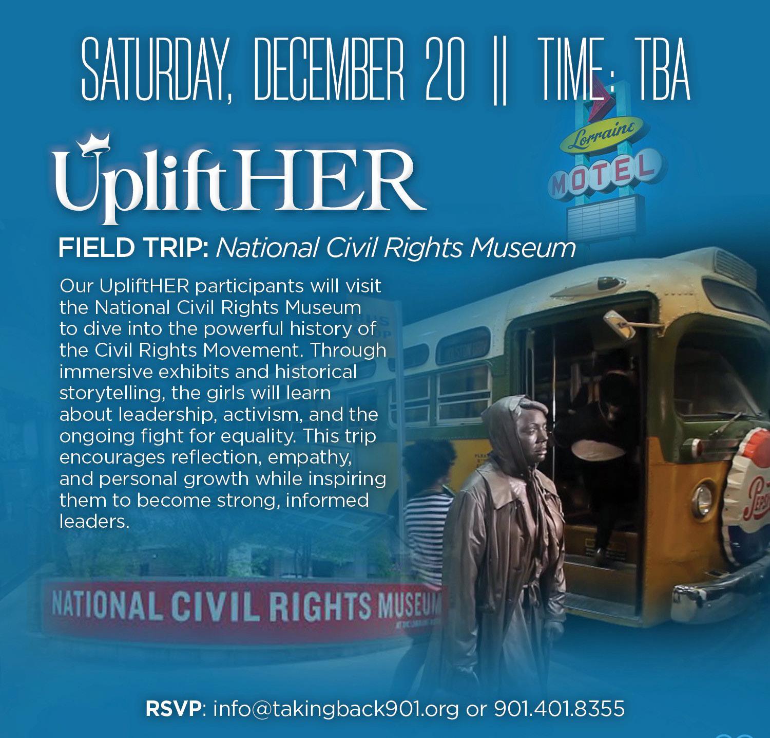 The UpliftHER cohort will visit the National Civil Rights Museum for a powerful and educational experience exploring the history of the Civil Rights Movement. Participants will walk through interactive exhibits, historical artifacts, and immersive displays that highlight the struggle for equality and justice in America. This trip is designed to deepen their understanding of social change, leadership, and the importance of advocacy within their own communities. The experience inspires reflection, encourages empathy, and aligns with UpliftHER’s mission to empower young women to be informed, confident, and engaged leaders.