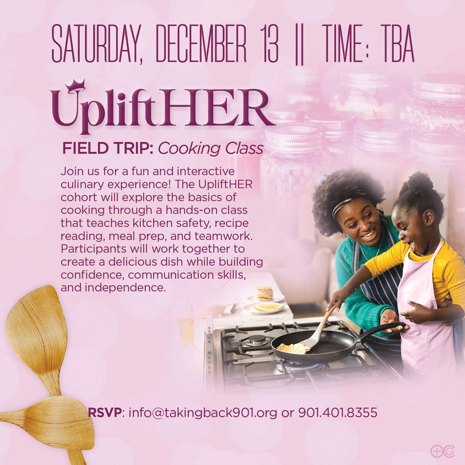The UpliftHER cohort will participate in an engaging and hands-on cooking class designed to build confidence, teamwork, and essential life skills. During this experience, participants will learn basic culinary techniques, kitchen safety, healthy meal preparation, and how to follow recipes step-bystep. This field trip promotes independence, creativity, and collaboration as the girls work together to prepare a full meal. The class encourages responsibility, communication, and practical skills they can use at home and throughout their lives.