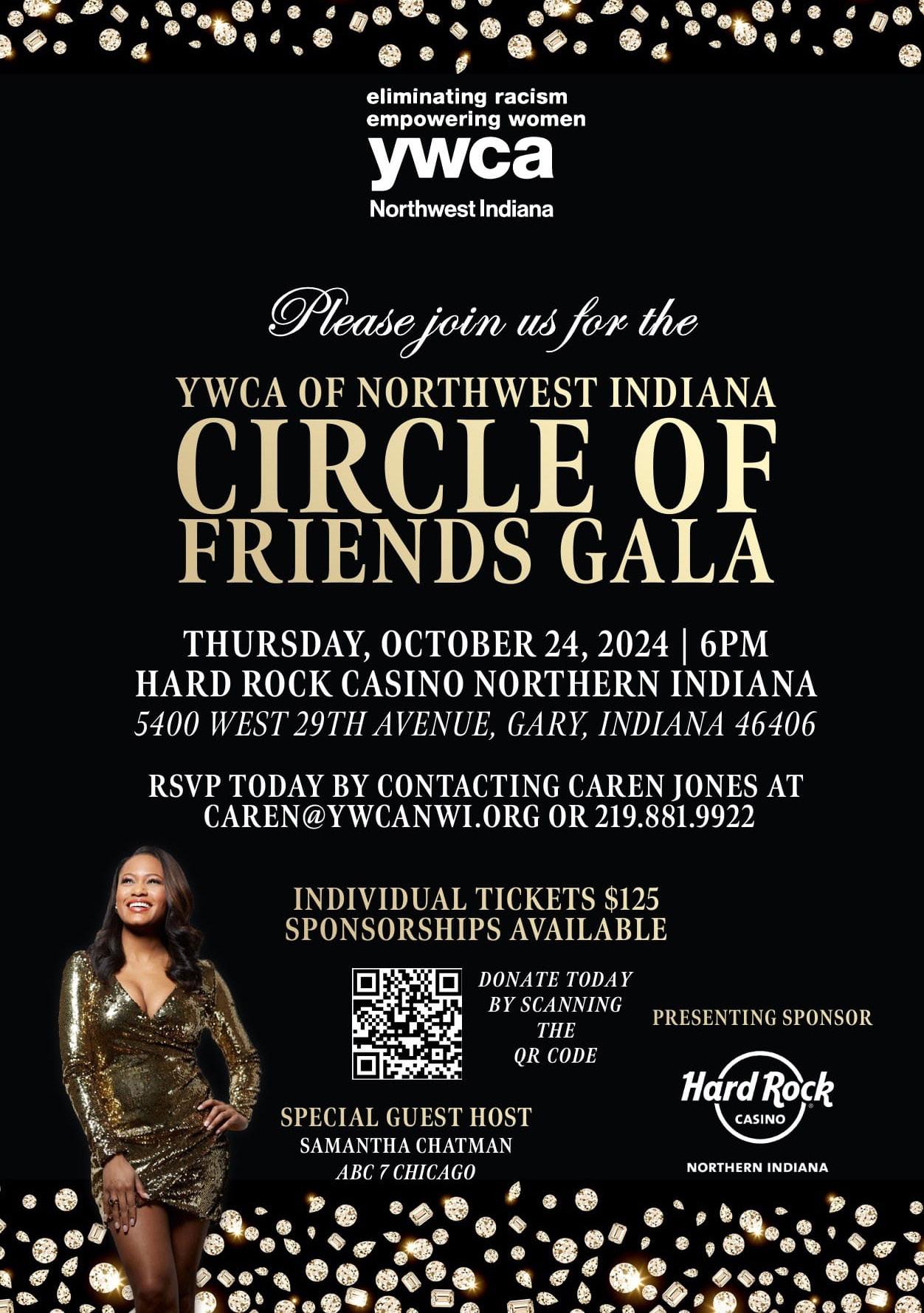 On Thursday, October 24, 2024, the YWCA of NWI will host its annual Circle of Friends Gala at the Hard Rock Casino Northern Indiana at 5400 W. 29th Ave. in Gary, IN. The event will start promptly at 6 p.m. Samantha Chatman of ABC 7 Chicago will serve as the celebrity host.