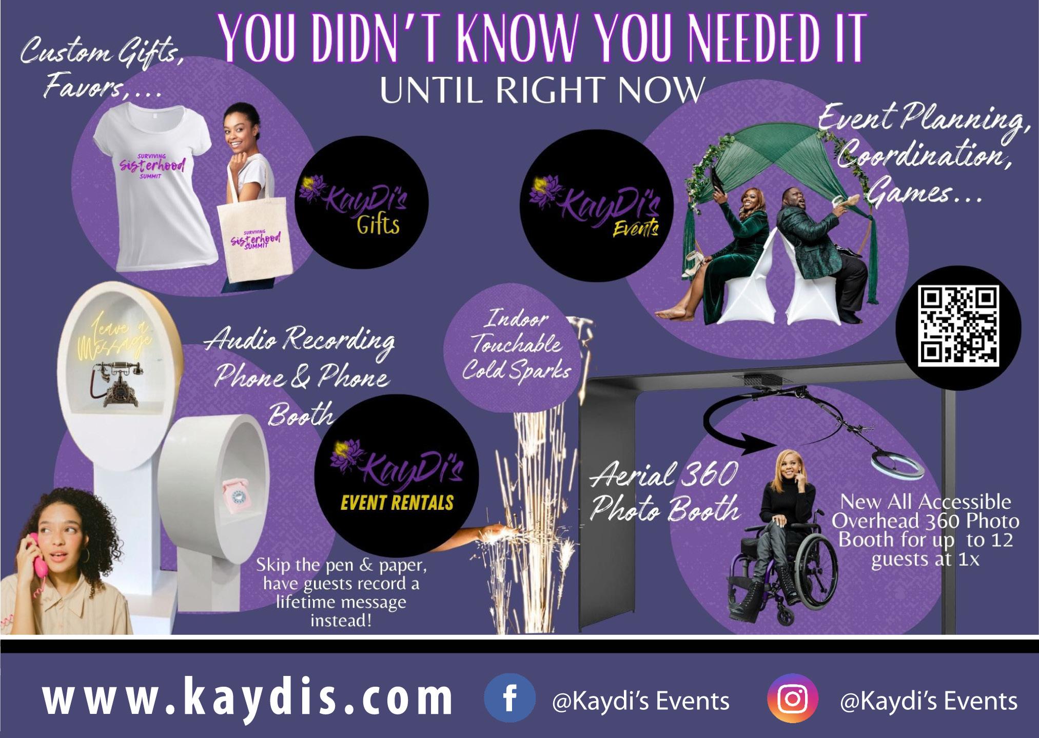 If you are thinking about starting an event planning business like that of KayDi’s Event Planning & Services, Kris offers some sound advice. “Be grateful that your problems are your problems. While the other side may look sweeter, you don’t know what journey or problems they went through to get where they are.”