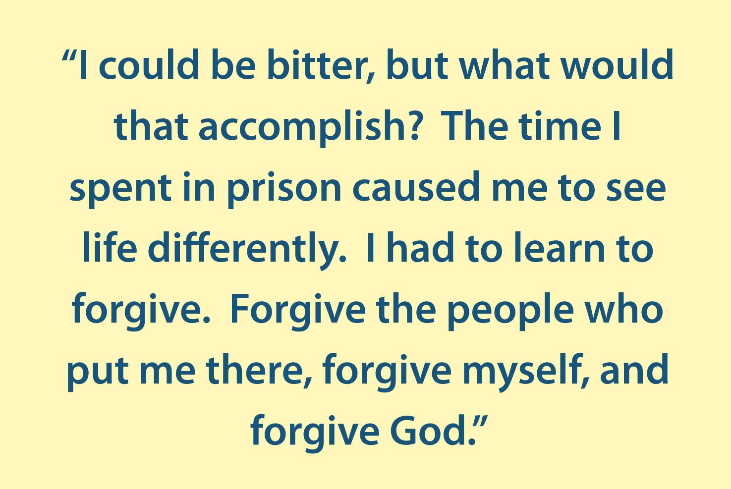 “I could be bitter, but what would that accomplish? The time I spent in prison caused me to see life differently. I had to learn to forgive. Forgive the people who put me there, forgive myself, and forgive God. Once you do that, you can have peace no matter where you are.”