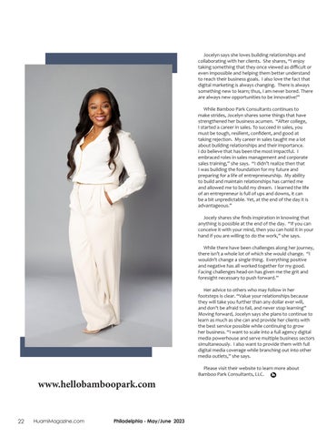 Located in the southern city of Huntsville, Alabama, an aspiring entrepreneur named Jocelyn Lewis is making waves as the owner of Bamboo Park Consultants, LLC. With a passion for empowering traditional brick-andmortar business owners, Jocelyn’s expertise lies in providing cutting-edge digital marketing services. Her goal is to help businesses enhance their online visibility, boost their bottom line, and maximize their market share. Some of the services they offer are Website Development, Social Media Management, Brand Management, Online Reputation Management, Google Profile, and Email Suite Development and Management, as well as Email and SMS Marketing.