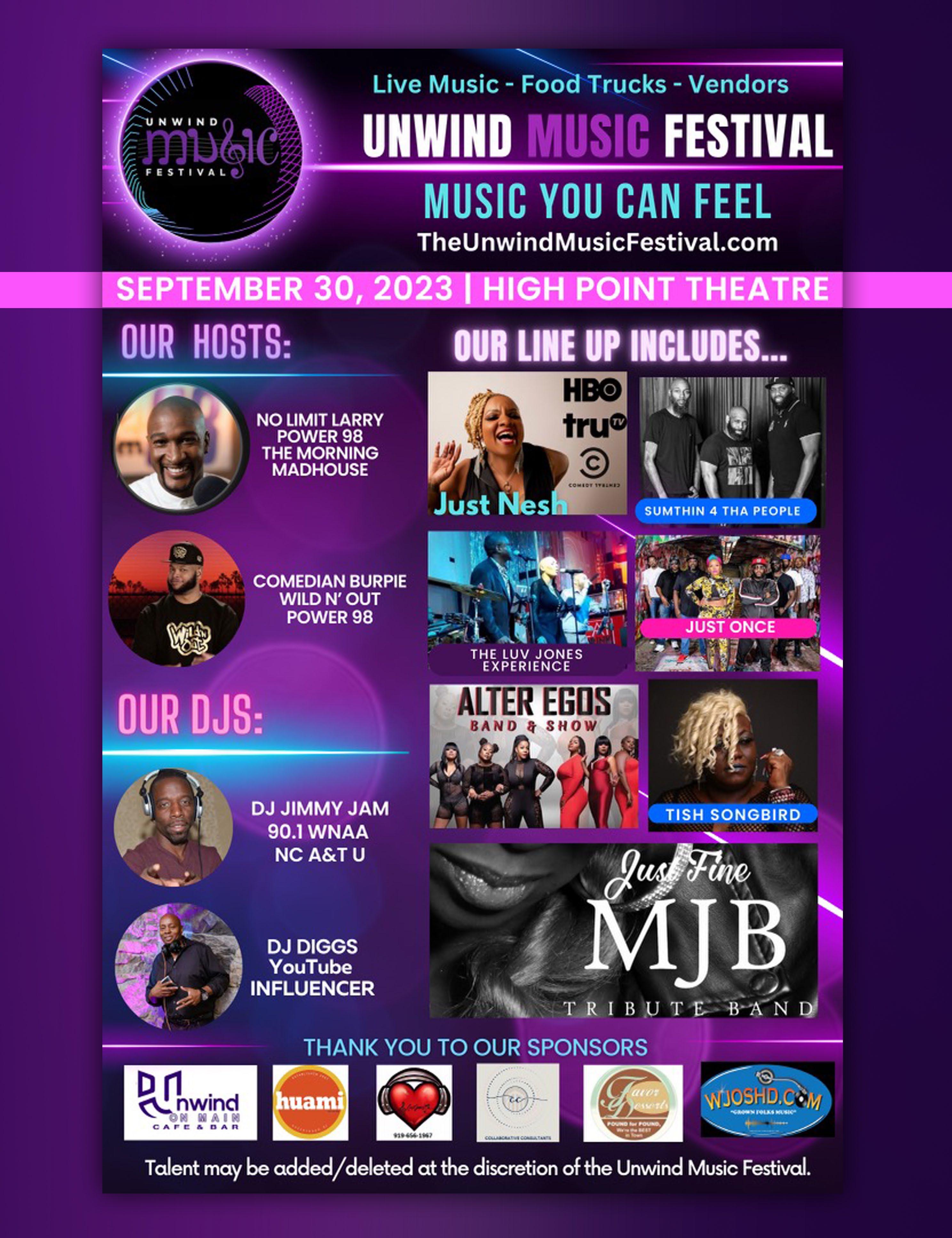Slated to happen on September 30, 2023, at the High Point Theater in High Point, NC. The one-day event will showcase musical talent from around North Carolina. There will be food trucks and vendors on sight, and much more. The team that is producing The Unwind Music Festival includes Anthony, along with his mother Norine Anderson, LaKeith Stevenson, Kika James, and Derrick Jones. The lineup of talent includes Just Once, The Luv Jones Experience, Sumthin 4 Tha People, Alter Egos, and a Mary J. Blige tribute produced by Just Fine.
