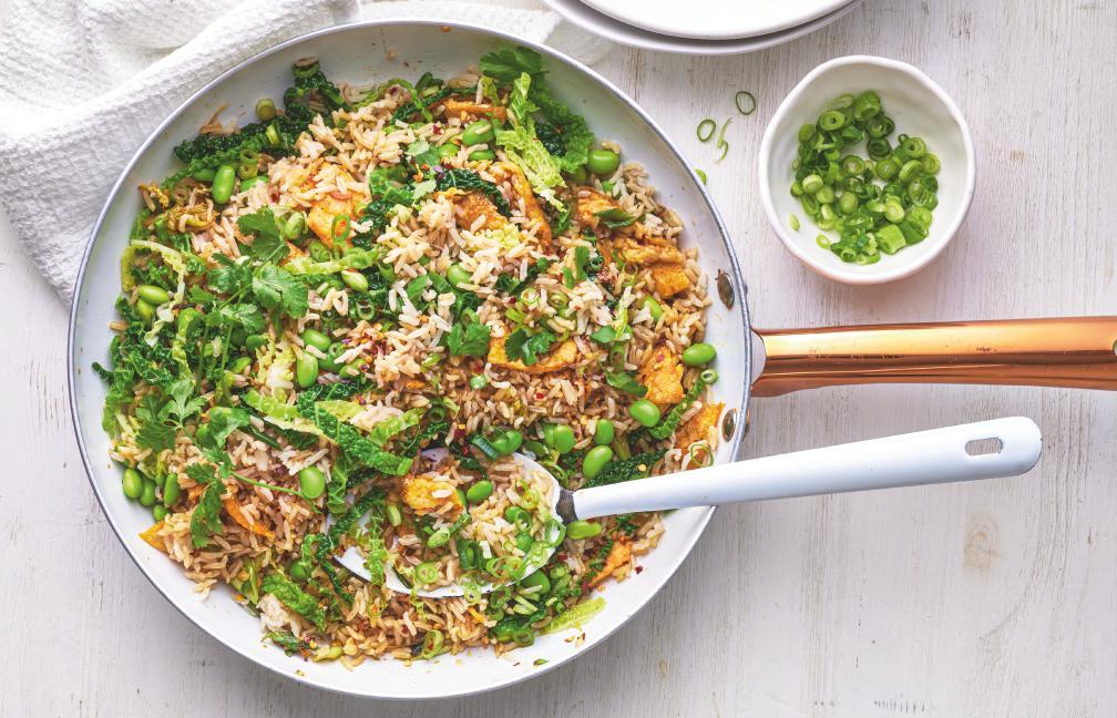 ‘After the indulgence of Christmas, we want a fresh start –and some fresh veg! Our new range of plant-powered grain packs (p12) will help spruce up your lunches without breaking the bank. You’ll also find easy swaps if you’re going vegan (p11), and fun fakeaway ideas to celebrate Chinese New Year – like this affordable, vegpacked stir-fry (right).’