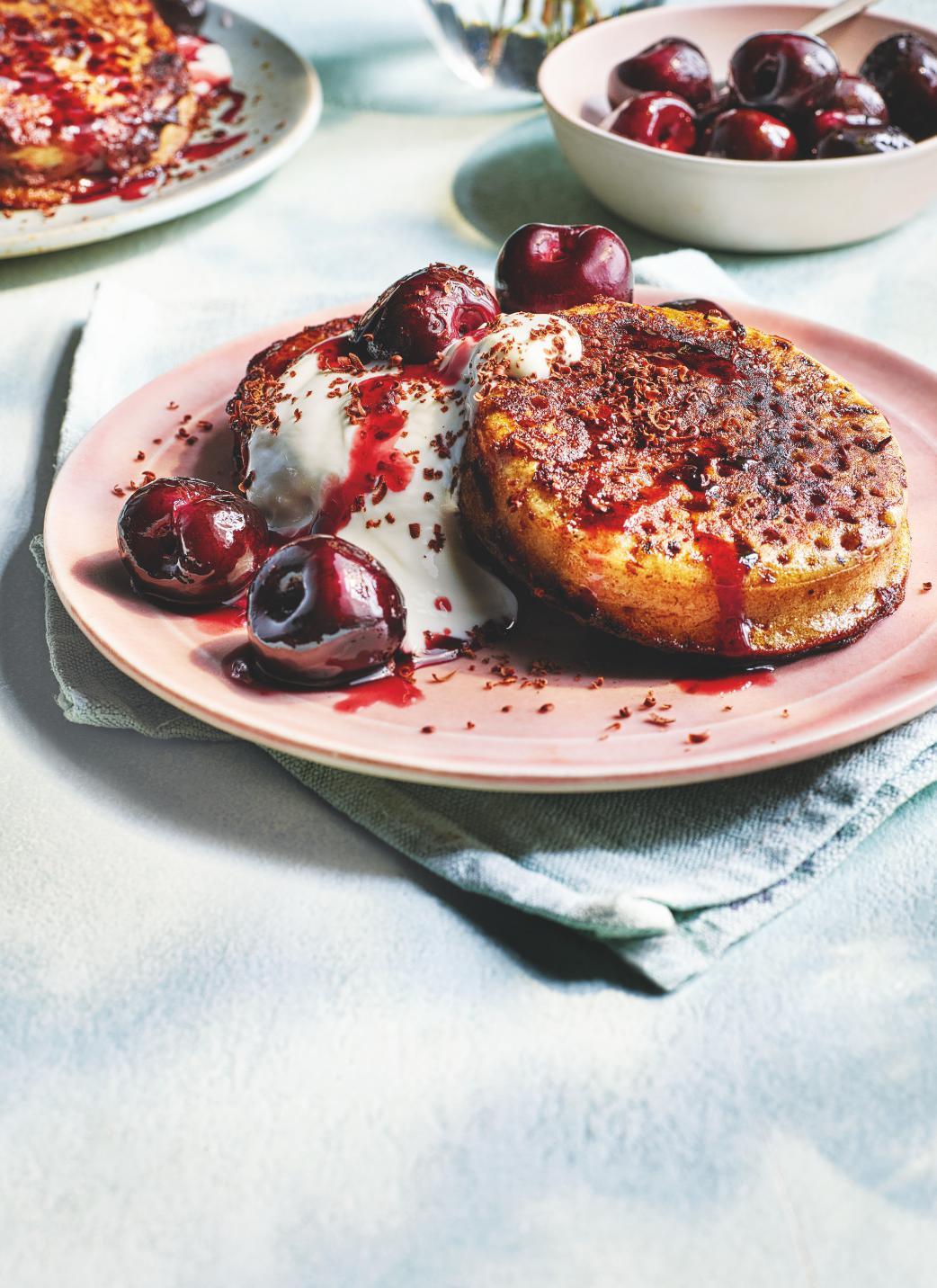 for 4-5 mins until saucy and slightly softened. Meanwhile, in a shallow baking dish or bowl, whisk 1 tsp cocoa powder with 75ml milk, 2 eggs and 2 tbsp caster sugar. Soak 4 crumpets in the liquid for 1 min each side. Melt ½ tbsp butter in a nonstick frying pan over a medium heat, then fry the crumpets for 2-3 mins each side until golden. Serve with 50g 0% Fat Greek-style