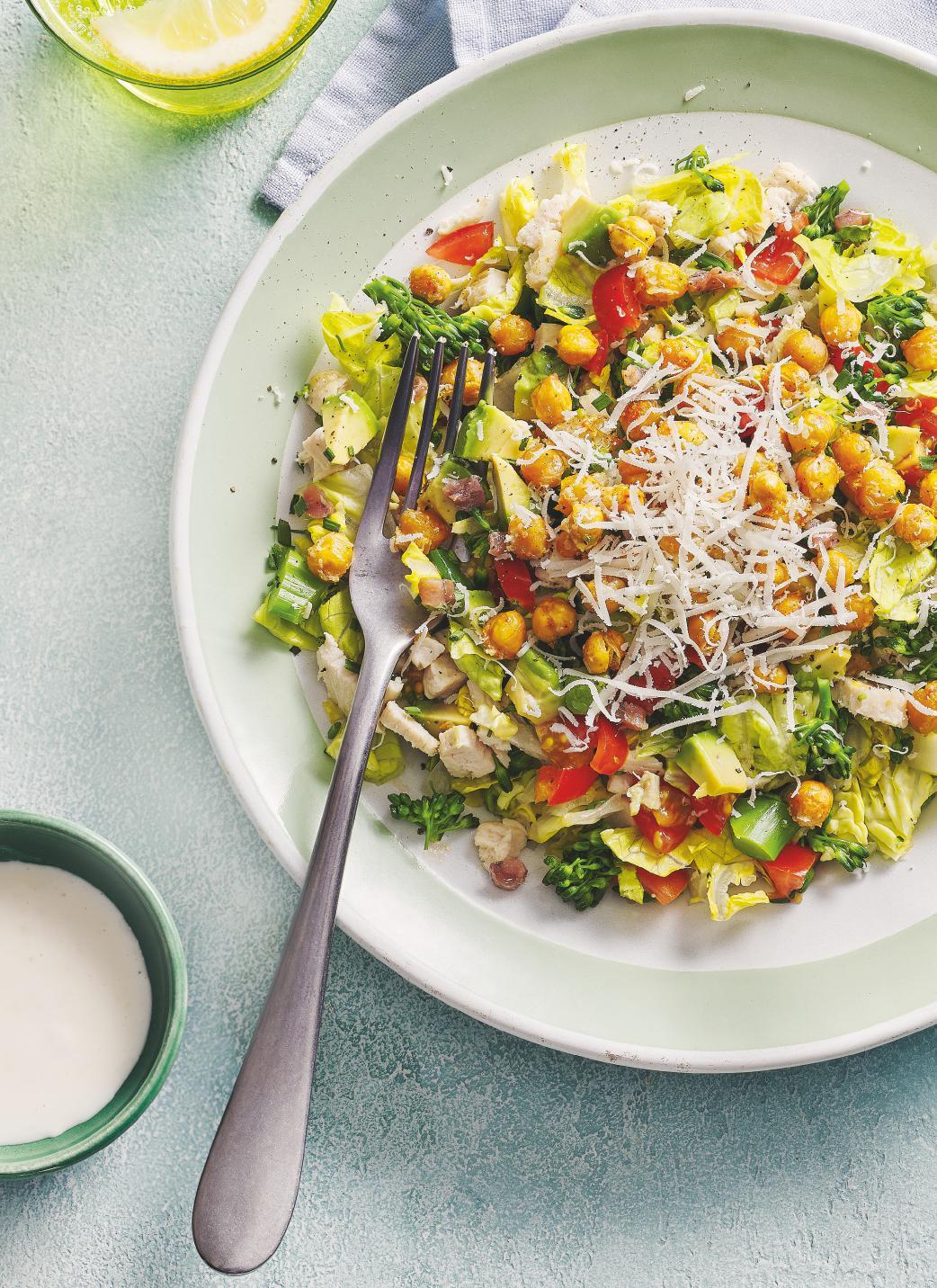 We’ve given a classic Caesar the chopped salad treatment. Try romaine lettuce, torn cooked chicken, cherry tomatoes, anchovies, avocado, Tenderstem broccoli and lots of fresh herbs. Top with crispy chickpea croutons, grated hard cheese, and add a little garlicky dressing.