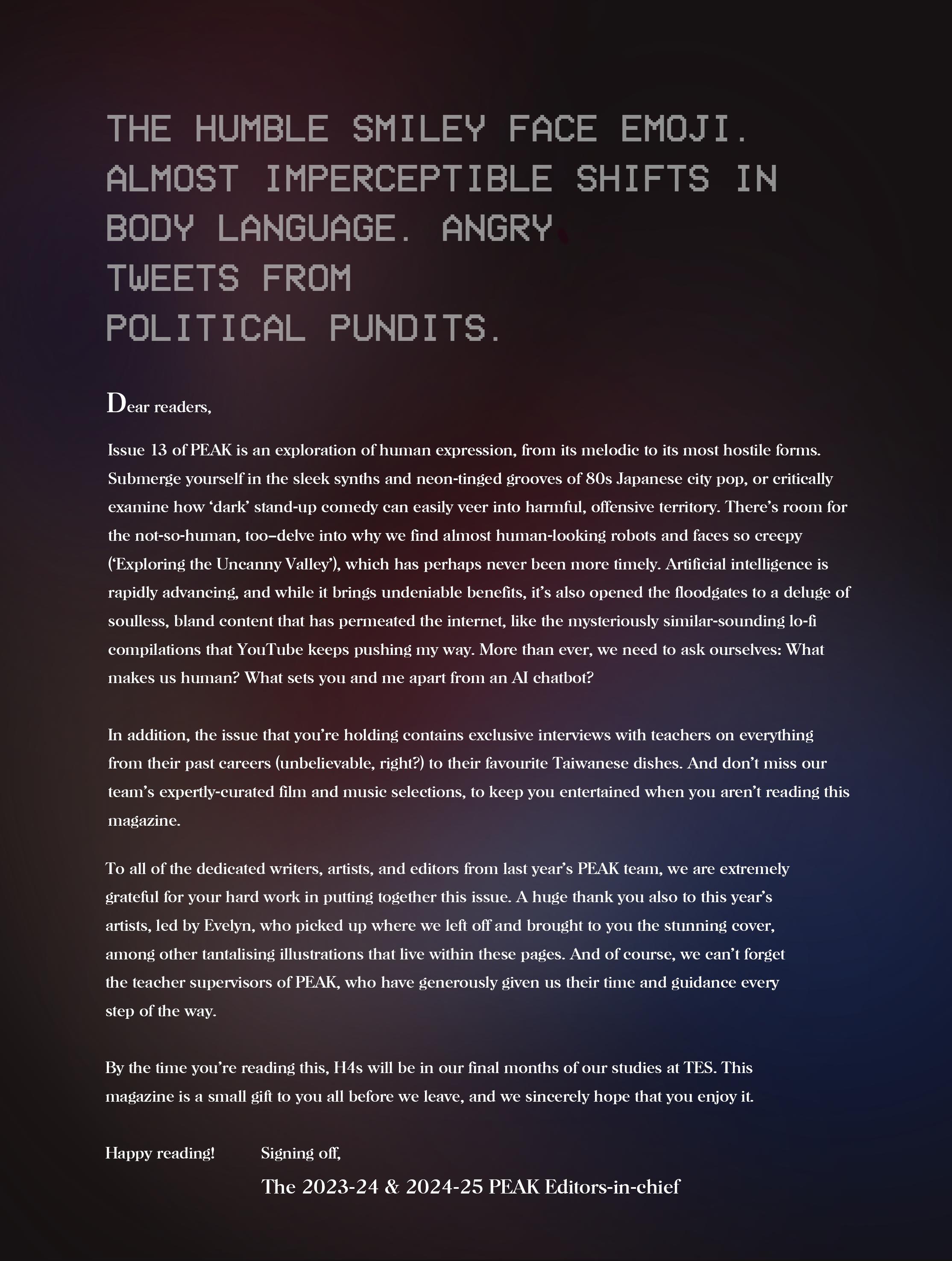 Write a letter responding to any article you wish by emailing teseditorialteam@tes.tp.edu.tw, beginning with “Dear Editor”, and it may be featured in the next issue! Please note that any inappropriate or anonymous letters will be disregarded.