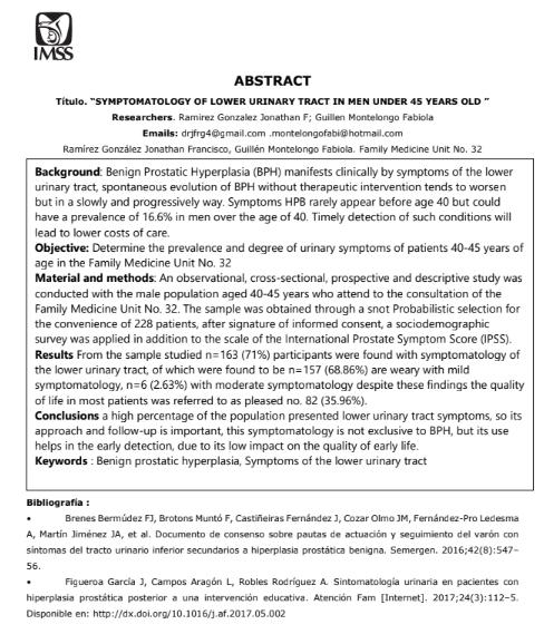 Sintomatología de tracto urinario inferior en hombres menores de 45 años. INSTITUTO MEXICANO DEL SEGURO SOCIAL UNIDAD DE MEDICINA FAMILIAR N° 32 ESPECIALIDAD DE MEDICINA FAMILIAR
