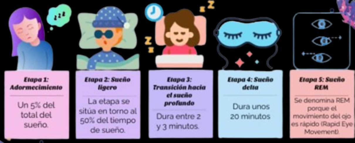 • Etapa 1 (N1 - Adormecimiento): Es la transición entre la vigilia y el sueño. Es un sueño muy ligero del que se puede despertar fácilmente. Dura solo unos minutos.
