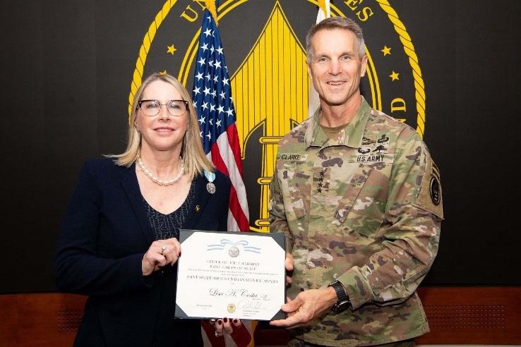 Receiving the Joint Staff Civilian Meritorious Service Medal from USSOCOM Commanding General Richard Clarke.