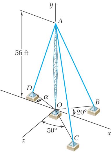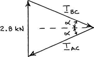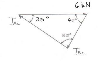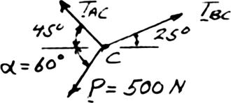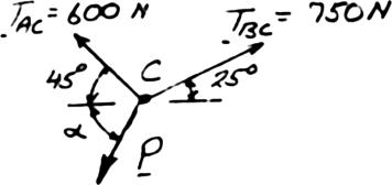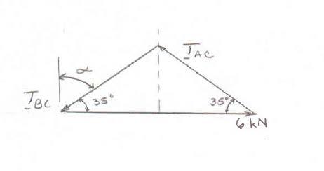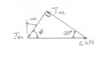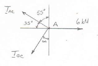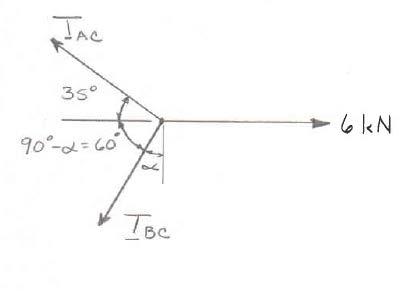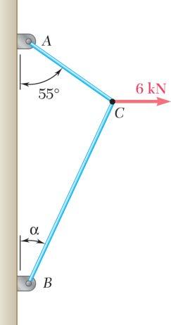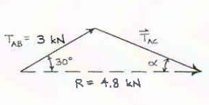 A disabled automobile is pulled by means of two ropes as shown. Knowing that the tension in rope AB is 3 kN, determine by trigonometry the tension in rope AC and the value of α so that the resultant force exerted at A is a 4.8kN force directed along the axis of the automobile.