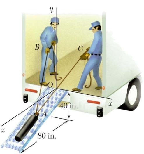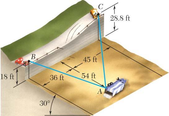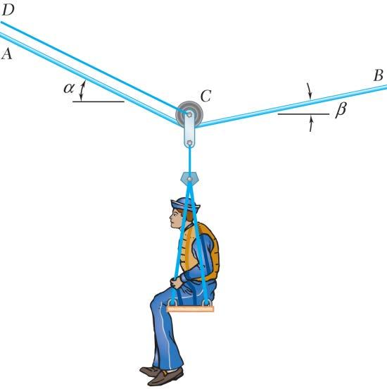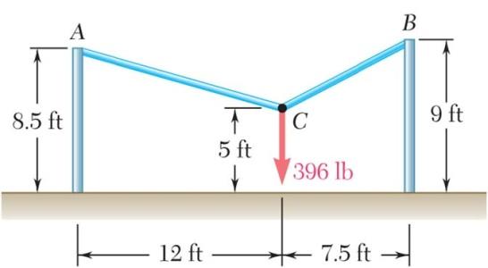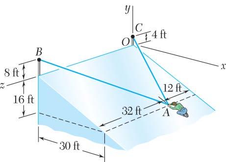 PROBLEM2.90 In trying to move across a slippery icy surface, a 175-lb man uses two ropes AB and AC. Knowing that the force exerted on the man by the icy surface is perpendicular to that surface, determine the tension in each rope.