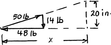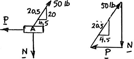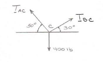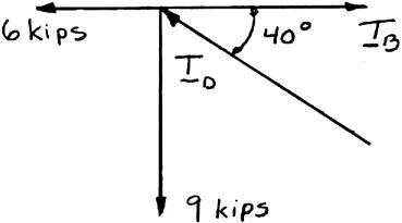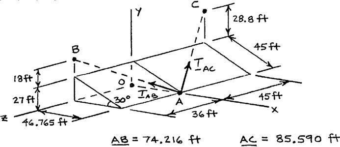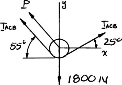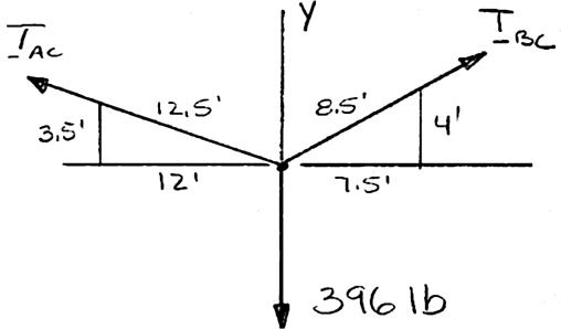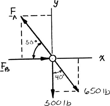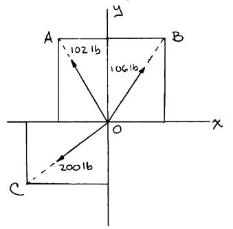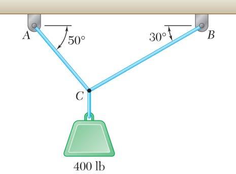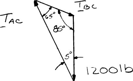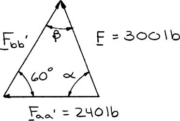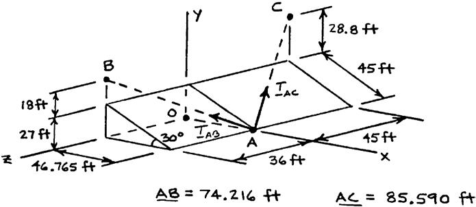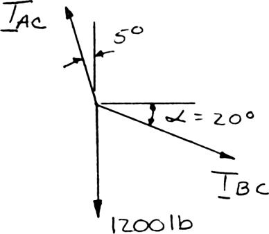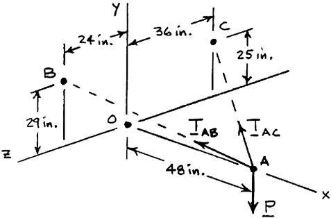 Substituting 1600 lb W = in Equations (1), (2), and (3) above, and solving the resulting set of equations using conventional algorithms, gives