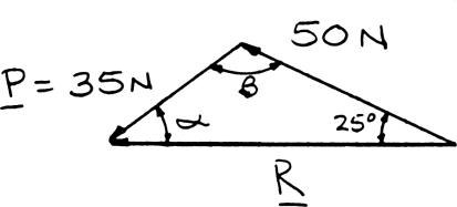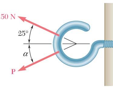 Two forces are applied as shown to a hook support. Knowing that the magnitude of P is 35 N, determine by trigonometry (a) the required angle α if the resultant R of the two forces applied to the support is to be horizontal, (b) the corresponding magnitude of R