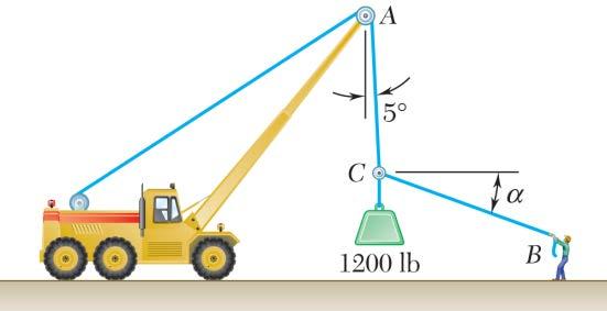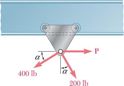 A hoist trolley is subjected to the three forces shown. Knowing that P = 250 lb, determine (a) the required value of α if the resultant of the three forces is to be vertical, (b) the corresponding magnitude of the resultant.