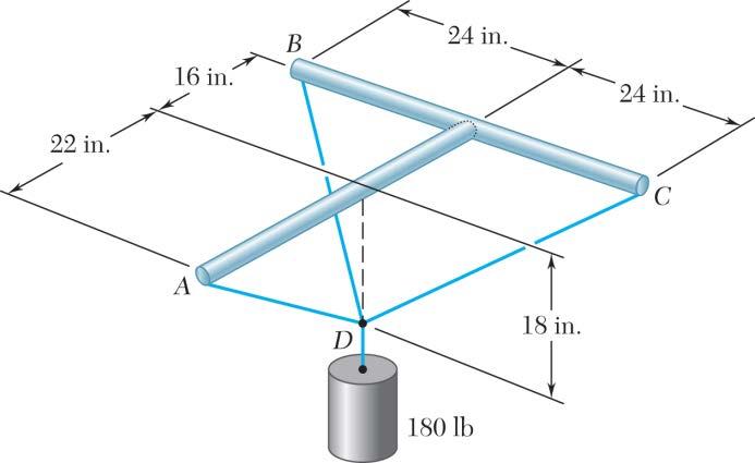 Three wires are connected at point D, which is located 18 in. below the T-shaped pipe support ABC. Determine the tension in each wire when a 180-lb cylinder is suspended from point D as shown.
