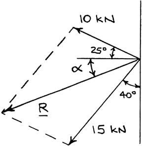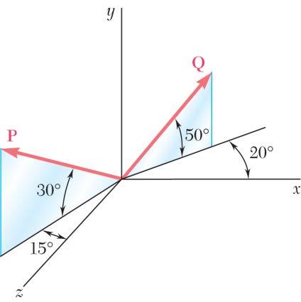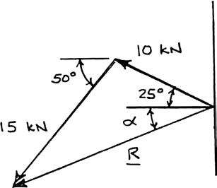 Two structural members B and C are bolted to bracket A. Knowing that both members are in tension and that P = 10 kN and Q = 15 kN, determine graphically the magnitude and direction of the resultant force exerted on the bracket using (a) the parallelogram law, (b) the triangle rule.
