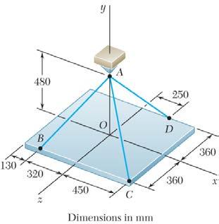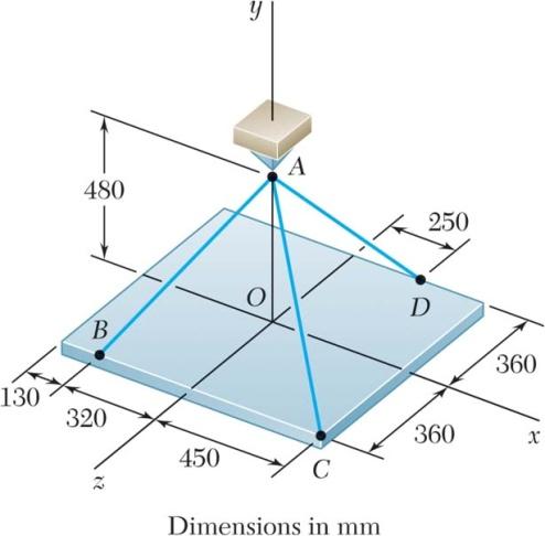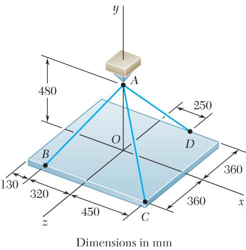 A rectangular plate is supported by three cables as shown. Knowing that the tension in cable AD is 520 N, determine the weight of the plate.