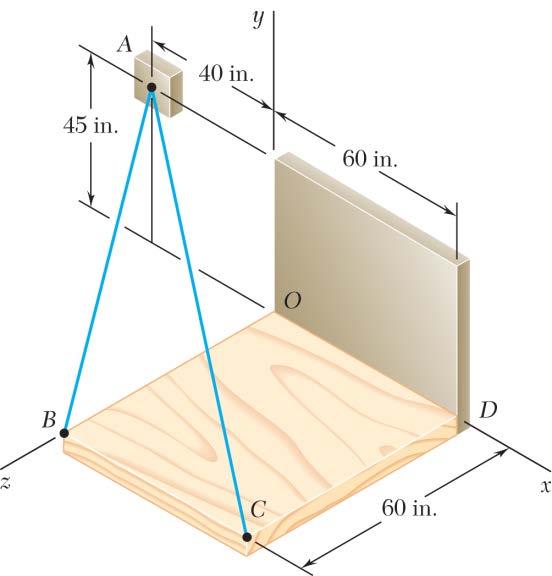 A rectangular plate is supported by three cables as shown. Knowing that the tension in cable AC is 60 N, determine the weight of the plate.