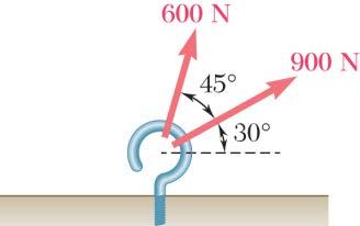 For the hook support shown, determine by trigonometry the magnitude and direction of the resultant of the two forces applied to the support.